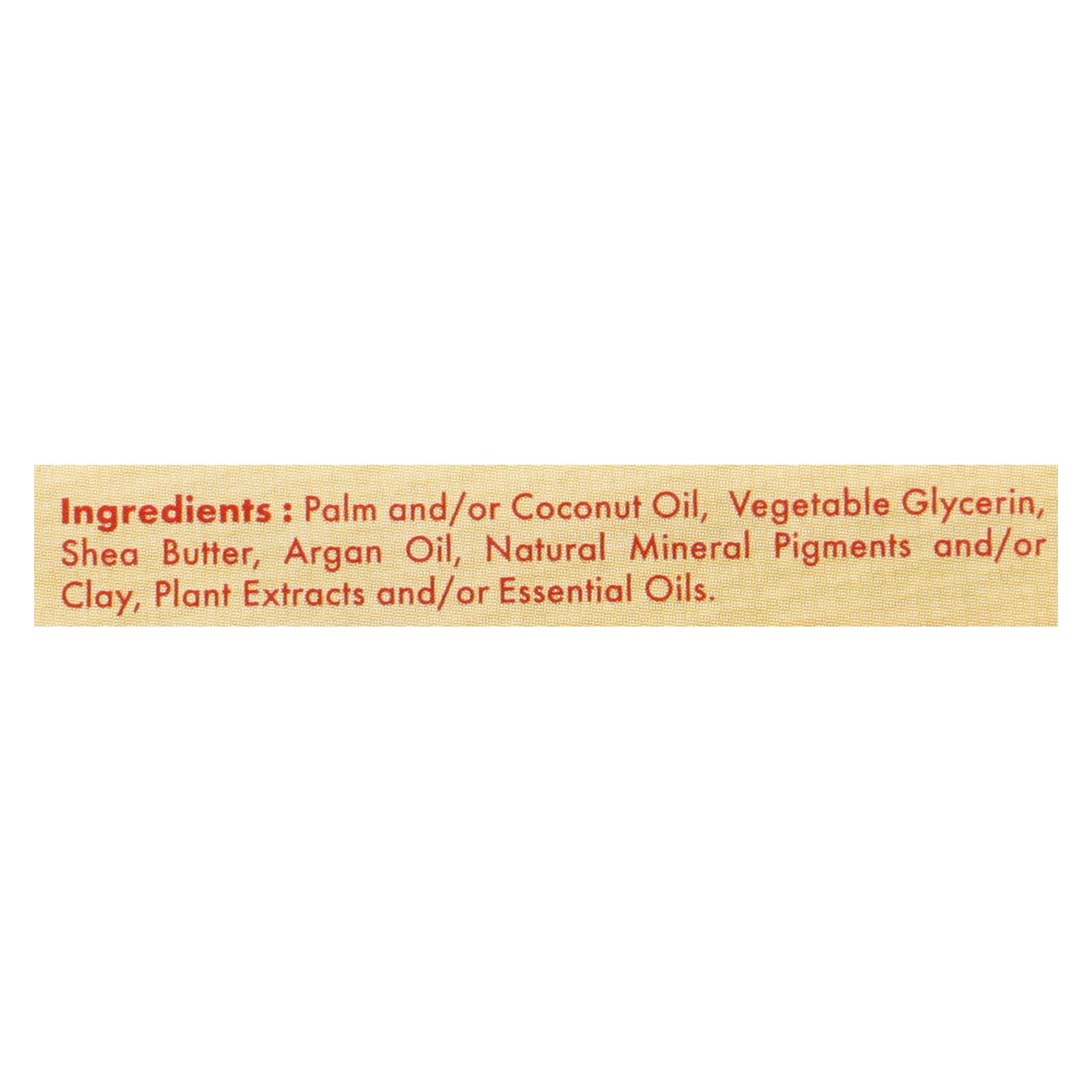 Palm and/or coconut oil, vegetable glycerin, shea butter, argan oil, natural mineral pigments and/or clay, plant extracts and/or essential oils.