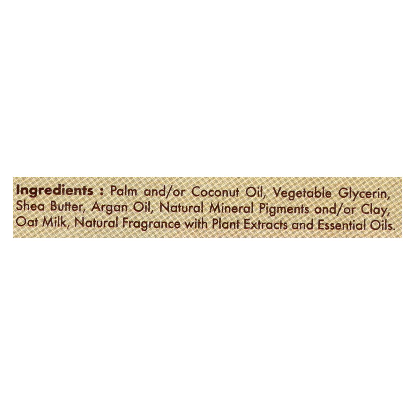 ingredients : palm and/or coconut oil;vegetable glycerin;shea butter;argan oil;natural mineral pigments and/or clay;oat milk;natural fragrance with plant extracts and essential oils