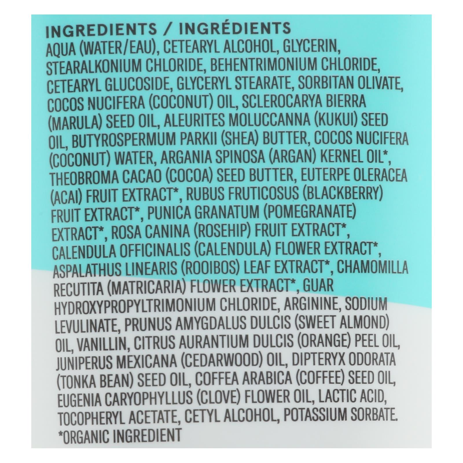 aqua (water/eau), cetearyl alcohol, glycerin, stearalkonium chloride, behentrimonium chloride, cetearyl glucoside, glyceryl stearate, sorbitan olivate, cocos nucifera (coconut) oil, sclerocarya bierra (marula) seed oil, aleurites moluccanna (kukui) seed oil, butyrospermum parkii (shea) butter, cocos nucifera (coconut) water, argania spinosa (argan) kernel oil, theobroma cacao (cocoa) seed butter, euterpe oleracea (acai) fruit extract, rubus fruticosus (blackberry) fruit extract, punica granatum (pomegranate) extract