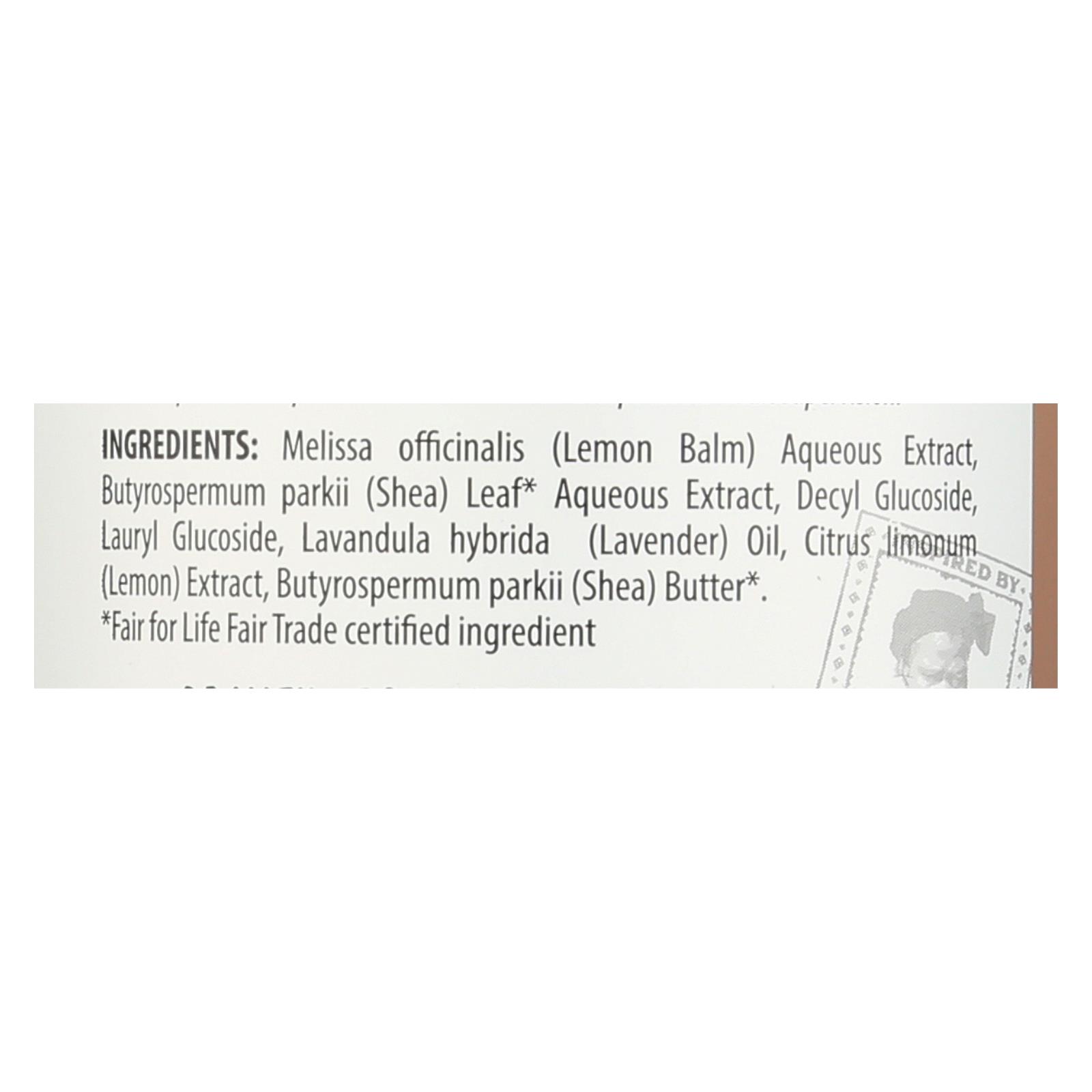 ingredients : melissa officinalis;lemon balm;aqueous extract;butyrospermum parkii;shea;leaf aqueous extract;decyl glucoside;lauryl glucoside;lavandula hybrida;lavender;oil;citrus limonum;lemon;extract;butter