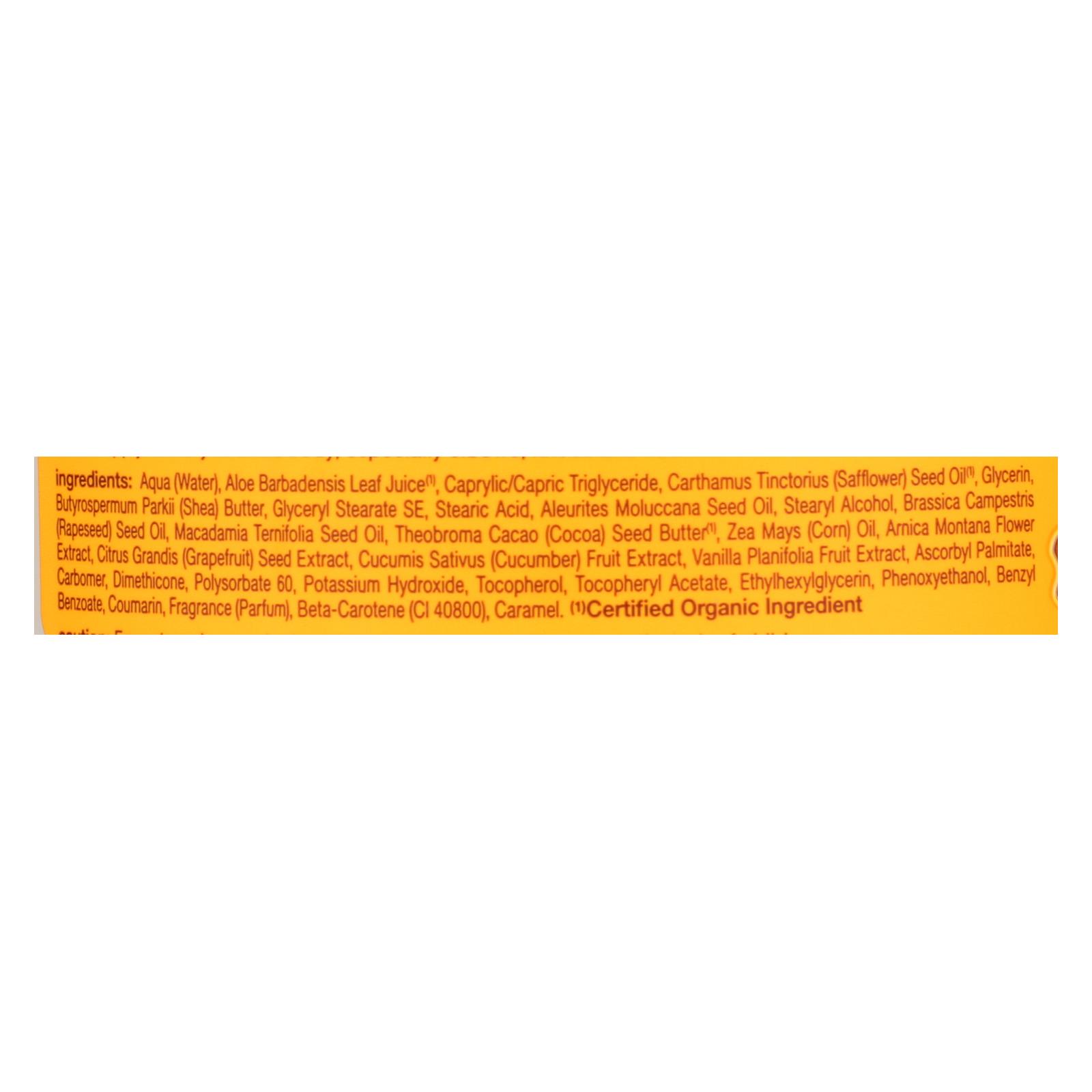 ingredients : aqua;water;aloe barbadensis leaf juice;¹;caprylic/capric triglyceride;carthamus tinctorius;safflower;seed oil;glycerin;butyrospermum parkii;shea;butter;glyceryl stearate se;stearic acid. Aleurites moluccana seed oil;stearyl alcohol;brassica campestris;rapeseed;macadamia ternifolia seed oil;theobroma cacao;cocoa;seed butter;zea mays;corn;oil;arnica montana flower extract;citrus grandis;grapefruit;seed extract;cucumis sativus;cucumber;fruit extract;vanilla planifolia fruit extract;ascorbyl palmita