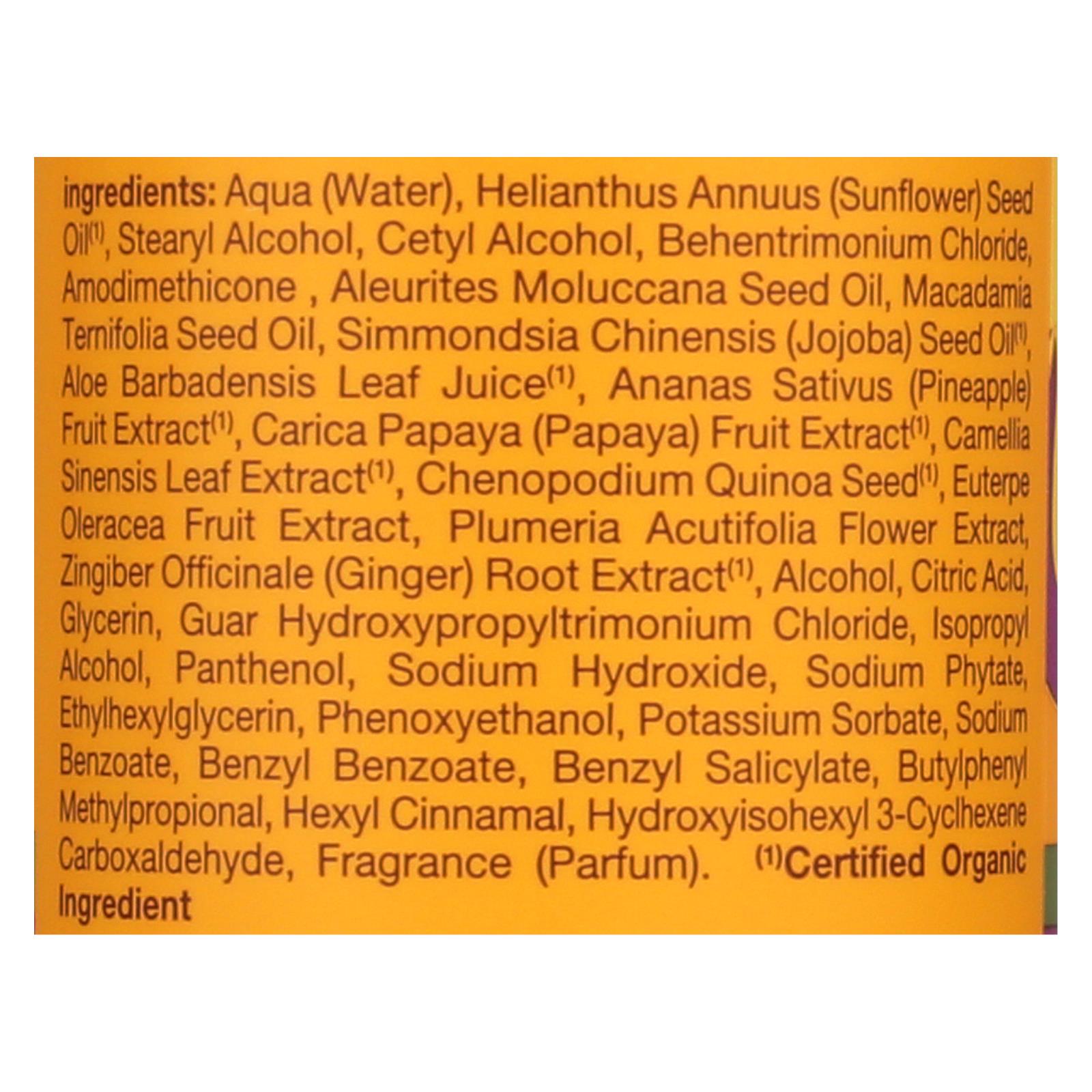 ingredients : aqua;water;helianthus annuus;sunflower;seed oil;¹;stearyl alcohol;cetyl alcohol;behentrimonium chloride;amodimethicone;aleurites moluccana seed oil;macadamia ternifolia seed oil;simmondsia chinensis;jojoba;aloe barbadensis leaf juice;ananas sativus;pineapple;fruit extract;carica papaya;papaya;camellia sinensis leaf extract;chenopodium quinoa seed;euterpe oleracea fruit extract;plumeria acutifolia flower extract;zingiber officinale;ginger;root extract;alcohol;citric acid;glycerin;guar hydroxyprop
