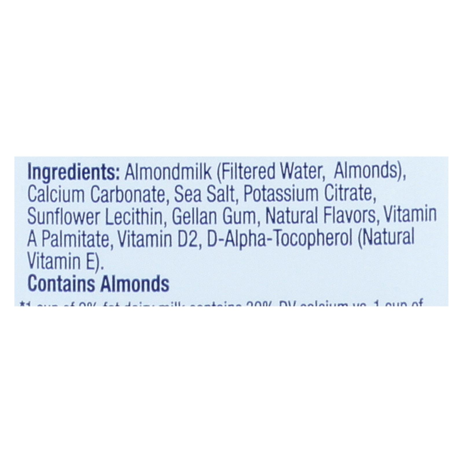 Almondmilk (filtered water, almonds), calcium carbonate, sea salt, potassium citrate, sunflower lecithin, gellan gum, natural flavors, vitamin A palmitate, vitamin D2, d-alpha-tocopherol (natural vitamin E).
