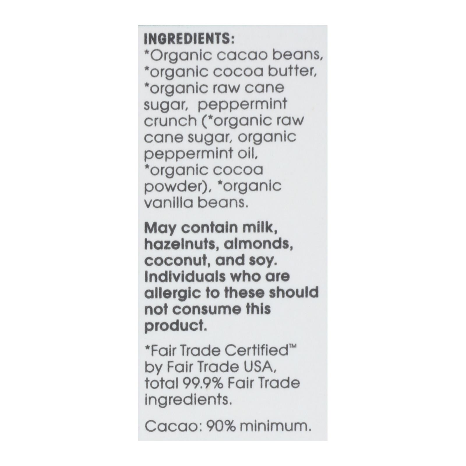 Organic cacao beans, organic cocoa butter, organic raw cane sugar, peppermint crunch (organic raw cane sugar, organic peppermint oil, organic cocoa powder), organic vanilla beans.