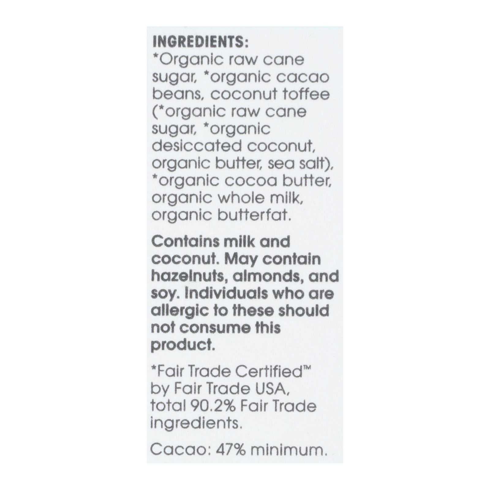 Organic raw cane sugar, organic cacao beans, coconut toffee (organic raw cane sugar, organic desiccated coconut, organic butter, sea salt), organic cocoa butter, organic whole milk, organic butterfat.