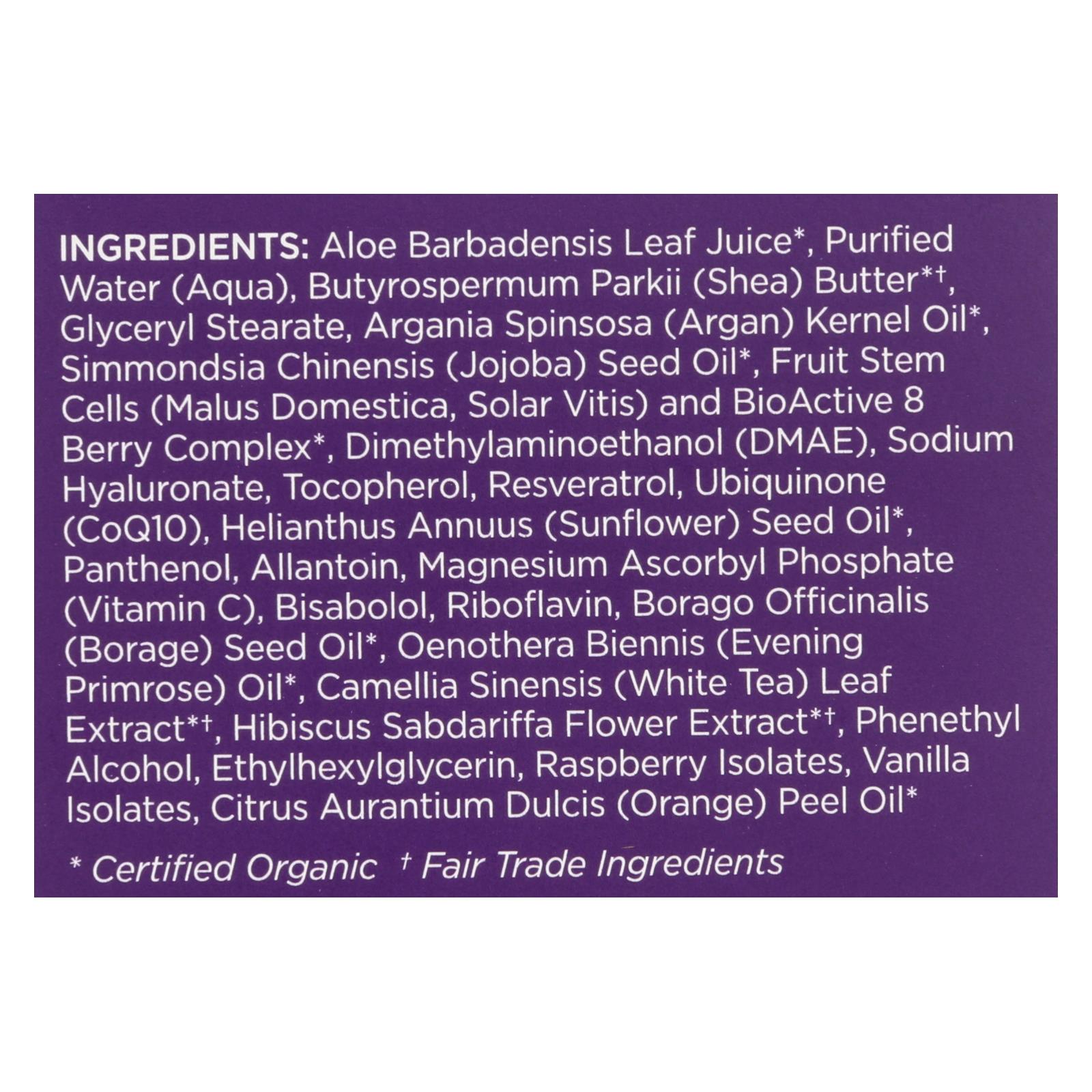 ingredients : aloe barbadensis leaf juice;purified water;aqua;butyrospermum parkii;shea;butter*†;glyceryl stearate;argania spinsosa;argan;kernel oil;simmondsia chinensis;jojoba;seed oil;fruit stem cells;malus domestica;solar vitis;and bioactive 8 berry complex;dimethylaminoethanol;dmae;sodium hyaluronate;tocopherol;resveratrol;ubiquinone;coq10;helianthus annuus;sunflower;panthenol;allantoin;magnesium ascorbyl phosphate;vitamin c;bisabolol;riboflavin;borago officinalis;borage;oenothera biennis;evening primrose