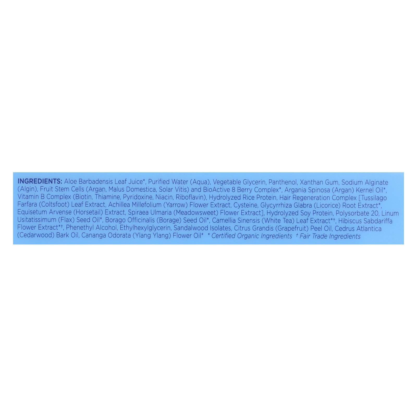 Aloe barbadensis juice, purified water (aqua), vegetable glycerin, panthenol, xanthan gum, sodium alginate, algin, fruit stem cells (argan, malus domestica, solar vitis), bioactive 8 berry complex, argania spinosa (kernel oil), vitamin B complex (biotin, thiamine, pyridoxine, niacin, riboflavin), hydrolyzed rice protein, hair regeneration complex [tussilago farfara (coltsfoot) leaf extract, achillea millefolium (yarrow) flower extract, cysteine, glycyrrhiza glabra (licorice) root extract, equisetum arvense (horsetail) extract].