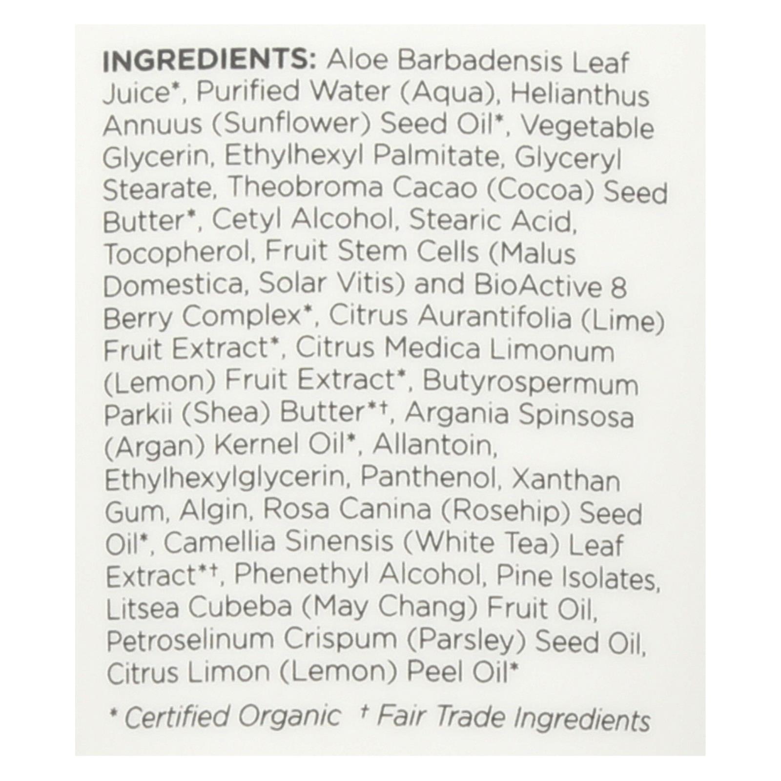 ingredients : aloe barbadensis leaf juice;purified water;aqua;helianthus annuus;sunflower;seed oil;vegetable glycerin;ethylhexyl palmitate;glyceryl stearate;theobroma cacao;cocoa;seed butter;cetyl alcohol;stearic acid;tocopherol;fruit stem cells;malus domestica;solar vitis;and bioactive 8 berry complex;citrus aurantifolia;lime;fruit extract;citrus medica limonum;lemon;butyrospermum parkii;shea;butter*†;argania spinsosa;argan;kernel oil;allantoin ethylhexylglycerin;panthenol;xanthan gum;algin;rosa canina;roseh