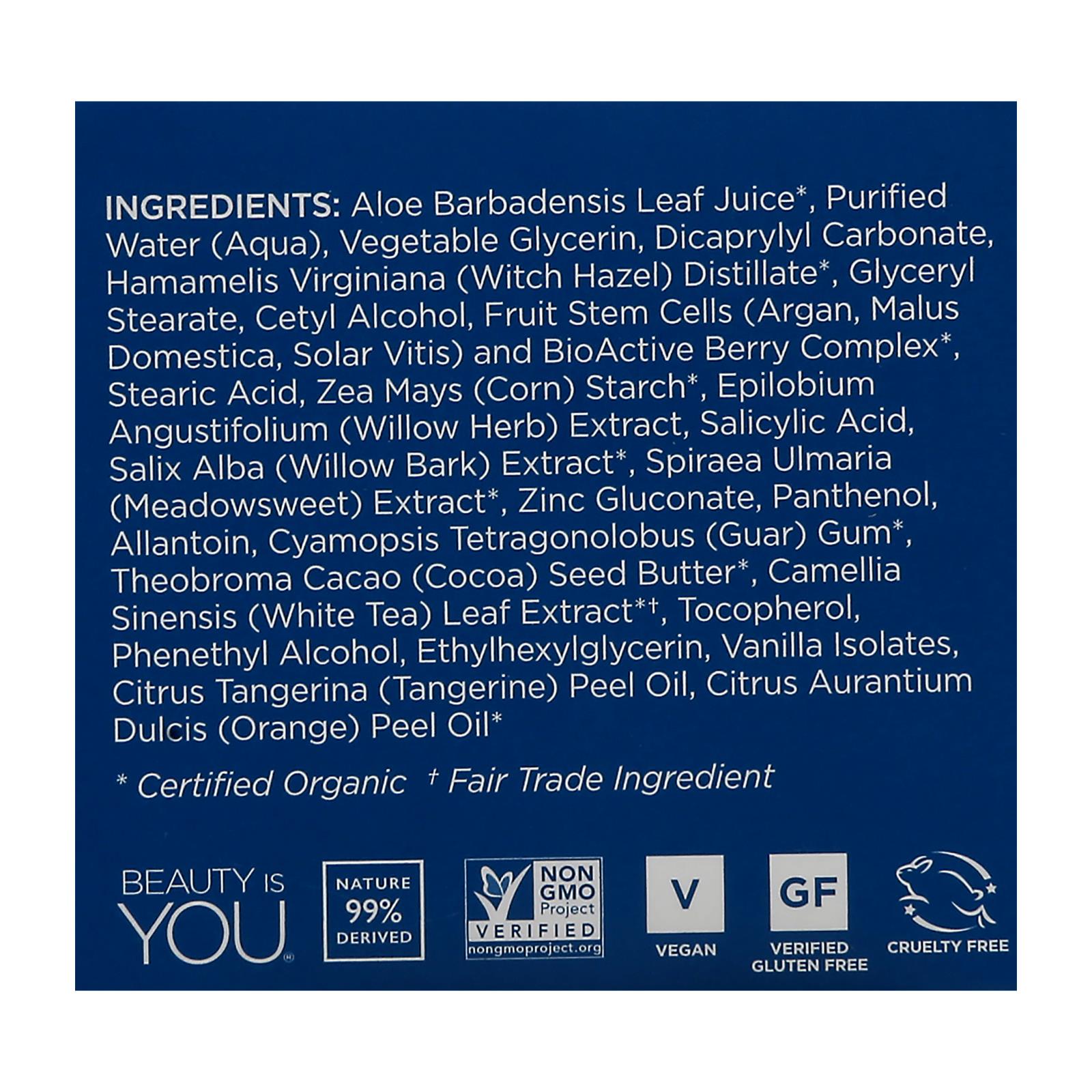 aloe barbadensis leaf juice, purified water (aqua), vegetable glycerin, dicaprylyl carbonate, hamamelis virginiana (witch hazel) distillate, glyceryl stearate, cetyl alcohol, fruit stem cells (argan, malus domestica, solar vitis) and bioactive 8 berry complex, stearic acid, zea mays (corn) starch, epilobium angustifolium (willow herb) extract, salicylic acid, salix alba (willow) bark, zinc gluconate, panthenol, allantoin, cyamopsis tetragonolobus (guar) gum, theobroma cacao (cocoa) seed butter, camellia sinensis (white tea) leaf extract.