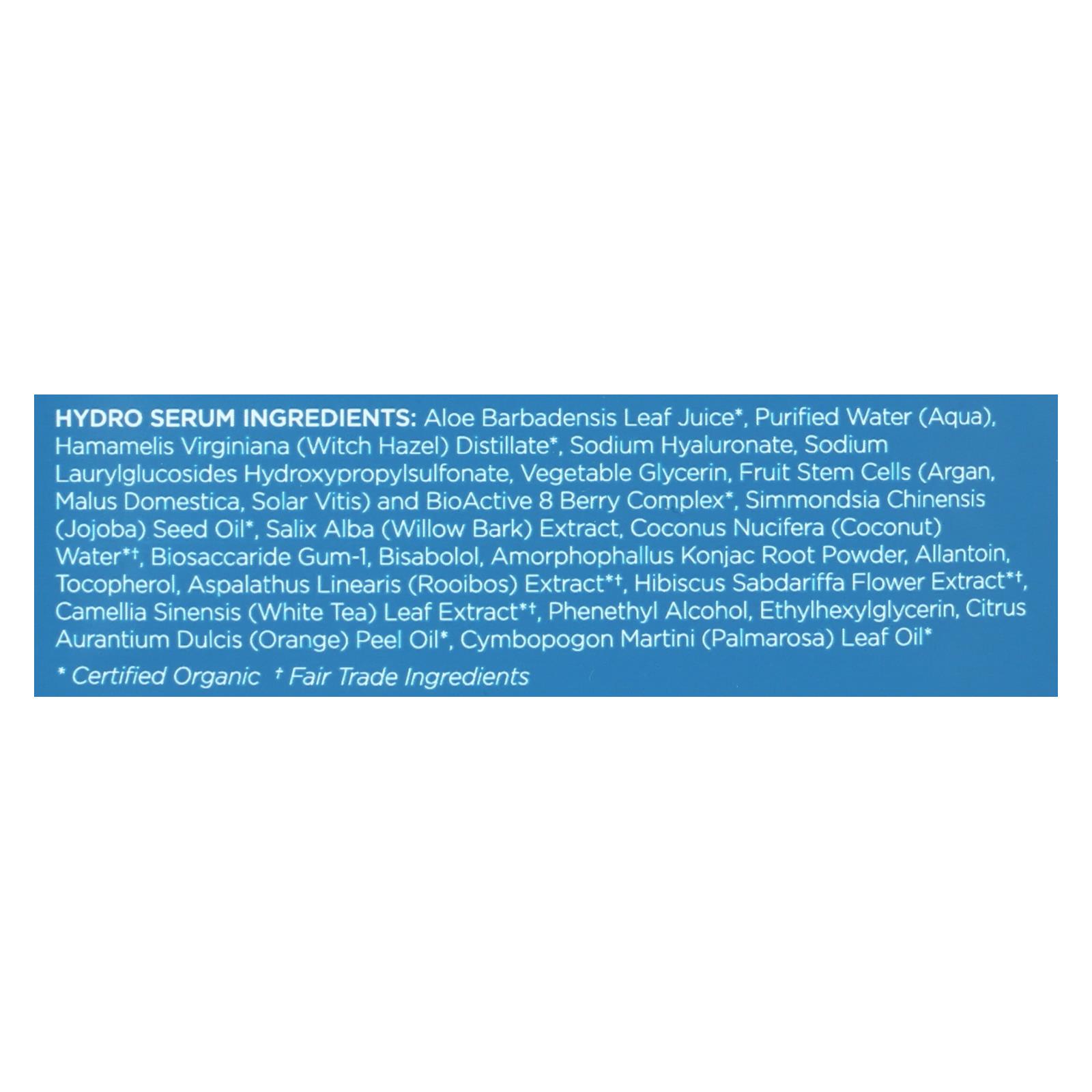Hydro serum aloe barbadensis leaf juice, purified water (aqua), hamamelis virginiana (witch hazel) distillate, sodium hyaluronate, sodium laurylglucosides hydroxypropylsulfonate, vegetable glycerin, fruit stem cells (argan, malus domestica, solar vitis) and bioactive 8 berry complex, simmondsia chinensis (jojoba) seed oil, salix alba (willow bark) extract, coconus nucifera (coconut) water*†, biosaccaride gum-1, bisabolol, amorphophallus konjac root powder, allantoin, tocopherol, aspalathus linearis (rooibos) extract*†, hibiscus.