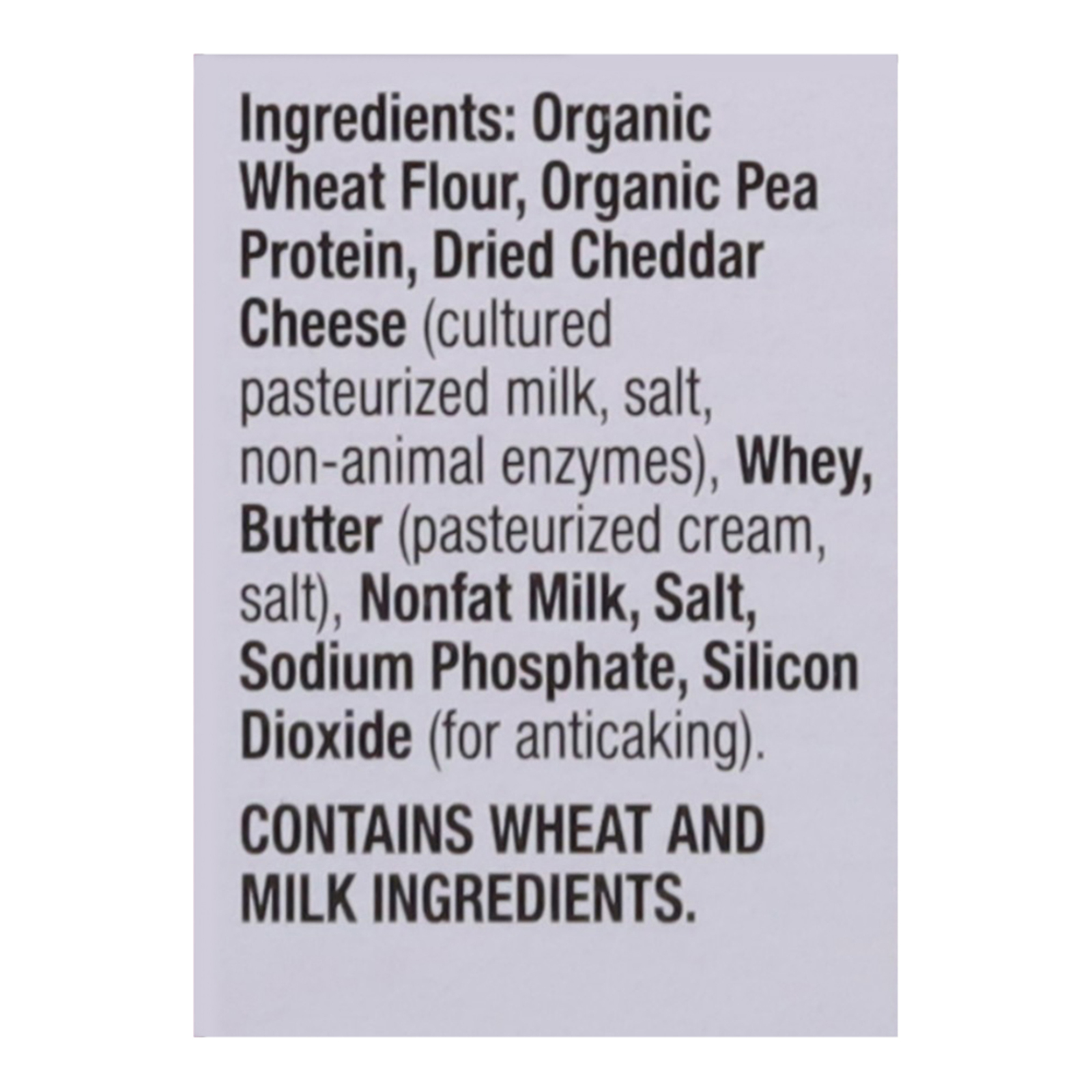 Organic pasta shells, white cheddar cheese (contains milk), and other ingredients as found in Annie’s Homegrown Mac & Cheese Shells with White Cheddar. (For a full list, please refer to the product packaging.)
