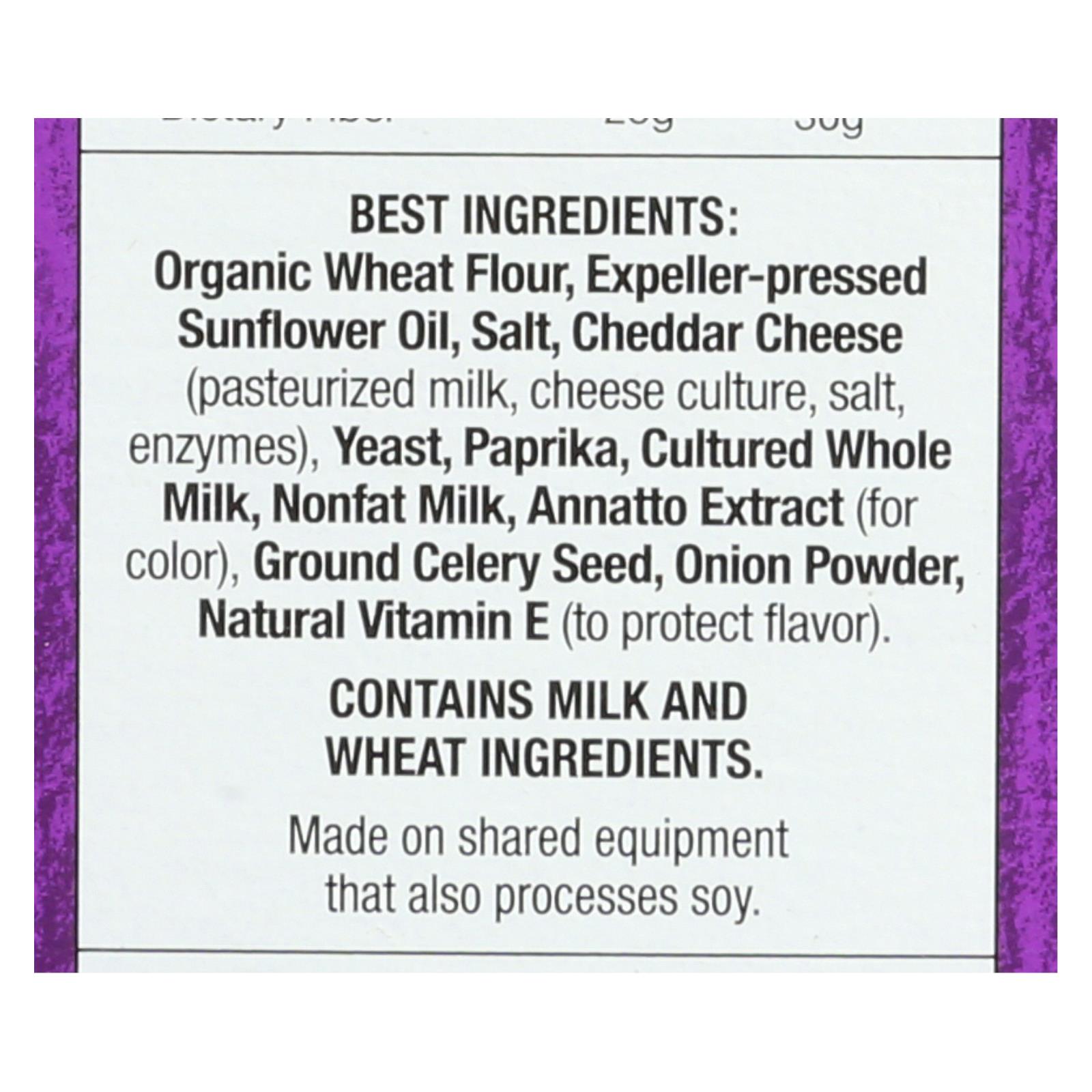 ingredients : best organic wheat flour;expeller-pressed sunflower oil;salt;cheddar cheese (pasteurized milk, cheese culture, salt, enzymes);yeast;paprika;cultured whole milk;nonfat milk;annatto extract (for color);ground celery seed;onion powder;natural vitamin e (to protect flavor)