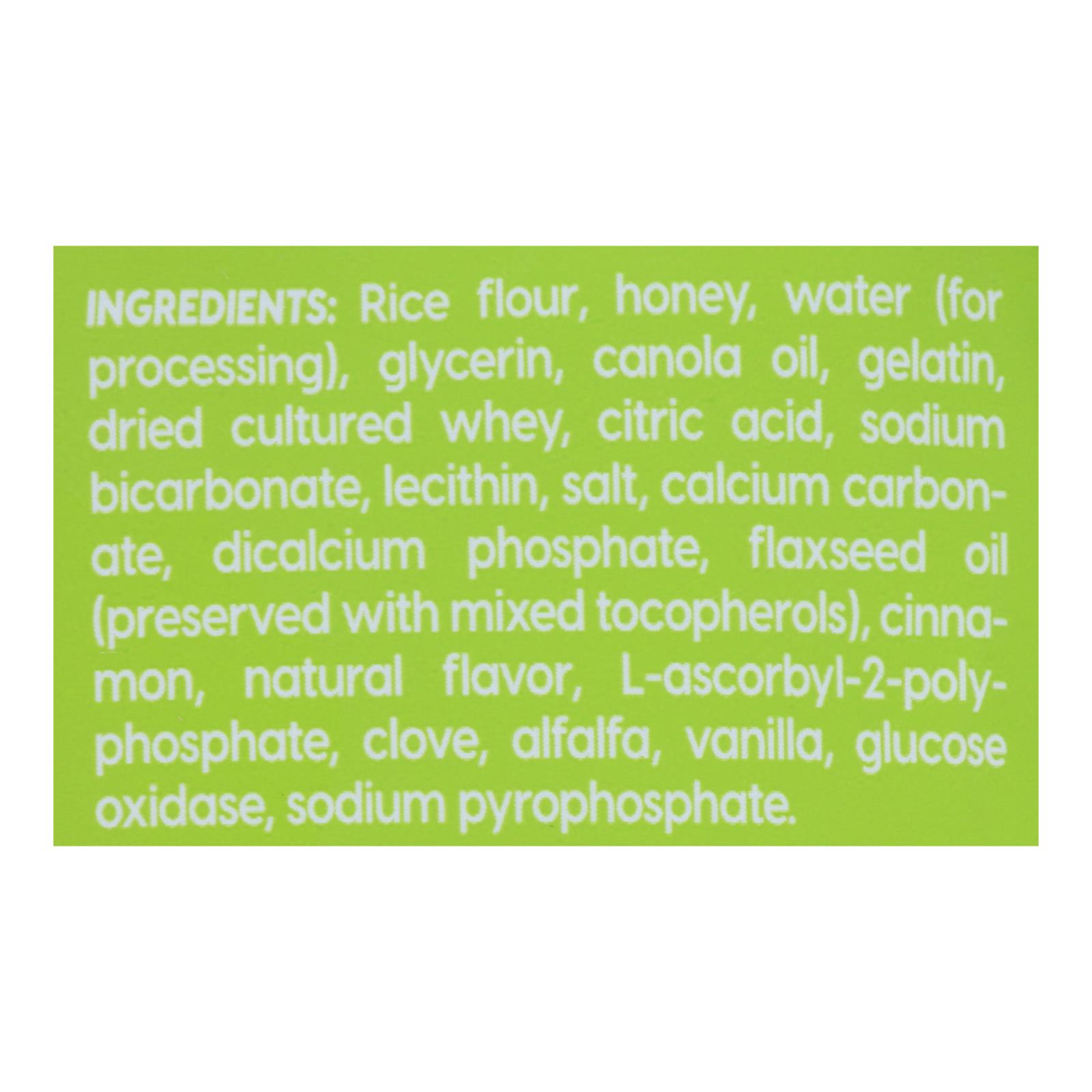 ingredients : rice flour;honey;water;for processing;glycerin;canola oil;gelatin;dried cultured whey;citric acid;sodium bicarbonate;lecithin;salt;calcium carbonate;dicalcium phosphate;flaxseed oil;preserved with mixed tocopherols;cinnamon;natural flavor;l-ascorbyl-2-polyphosphate;clove;alfalfa;vanilla;glucose oxidase;sodium pyrophosphate