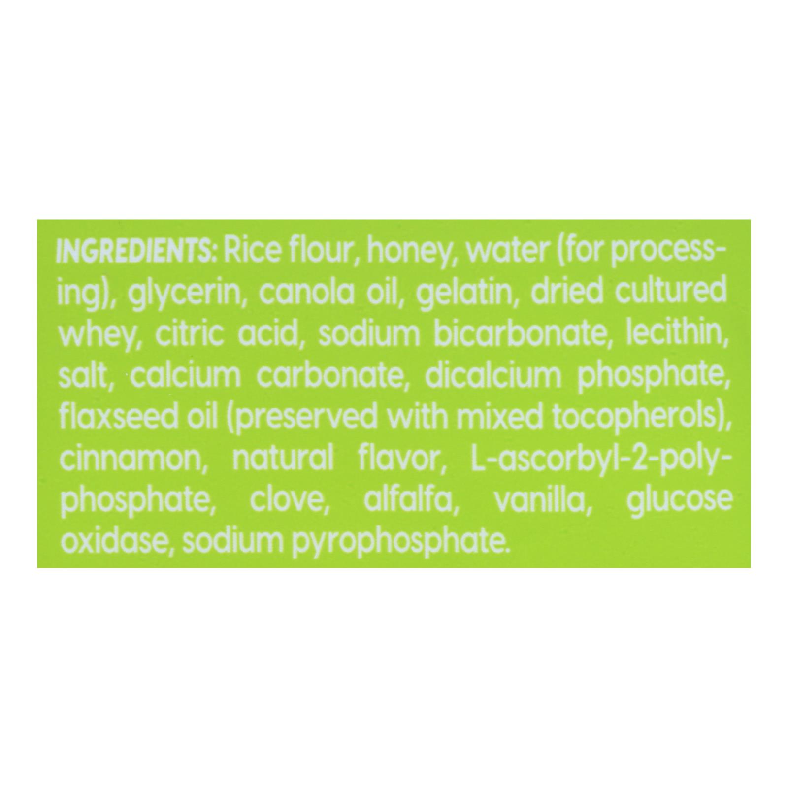 Rice flour, honey, water (for processing), glycerin, canola oil, gelatin, dried cultured whey, citric acid, sodium bicarbonate, lecithin, salt, calcium carbonate, dicalcium phosphate, flaxseed oil, preserved with mixed tocopherols, cinnamon, natural flavor, l-ascorbyl-2-poly-phosphate, clove, alfalfa, vanilla, glucose oxidase, sodium pyrophosphate.
