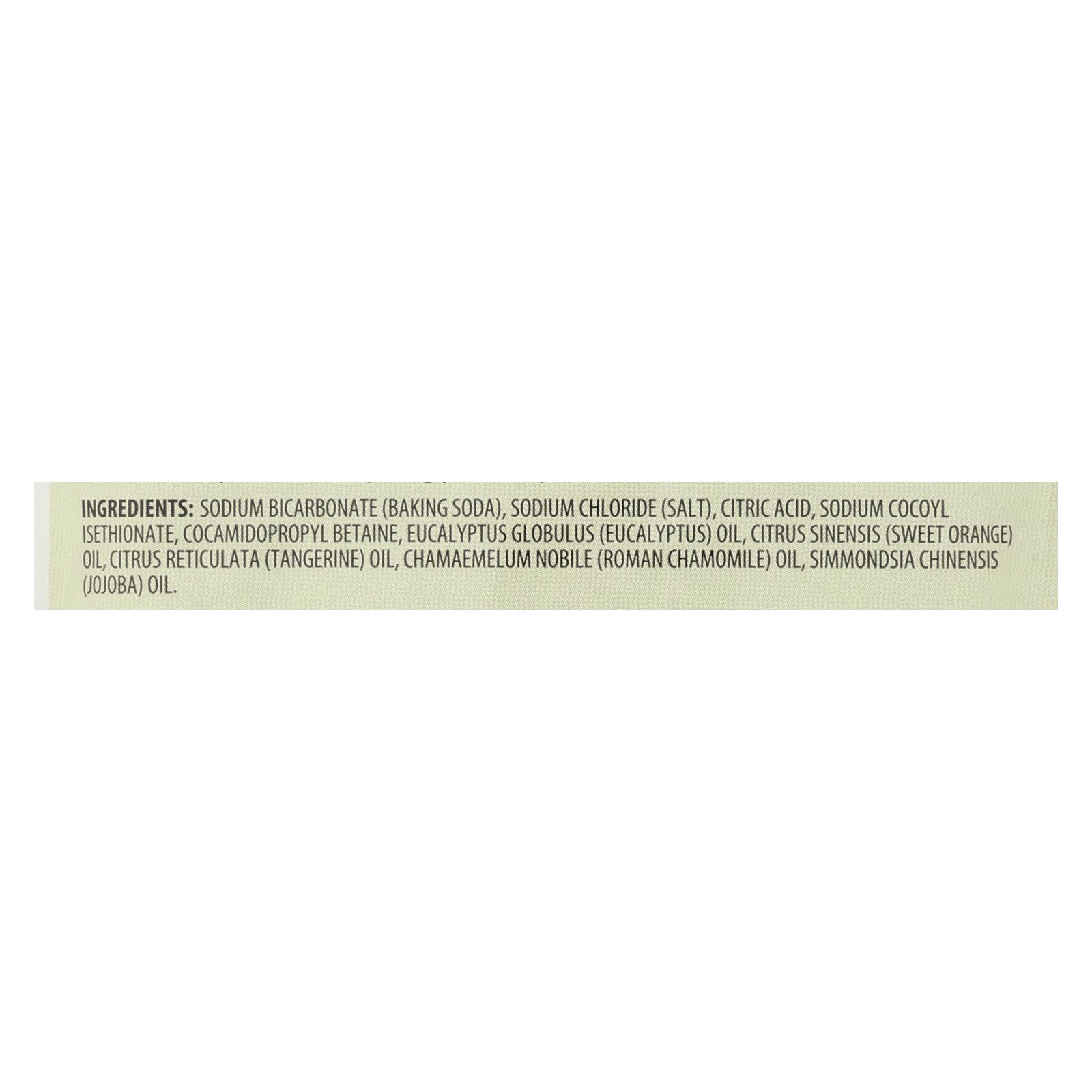 Sodium bicarbonate (baking soda), sodium chloride (salt), citric acid, sodium cocoyl isethionate, cocamidopropyl betaine, eucalyptus globulus (eucalyptus) oil, citrus sinensis (sweet orange) oil, citrus reticulata (tangerine) oil, chamaemelum nobile (roman chamomile), simmondsia chinensis (jojoba).