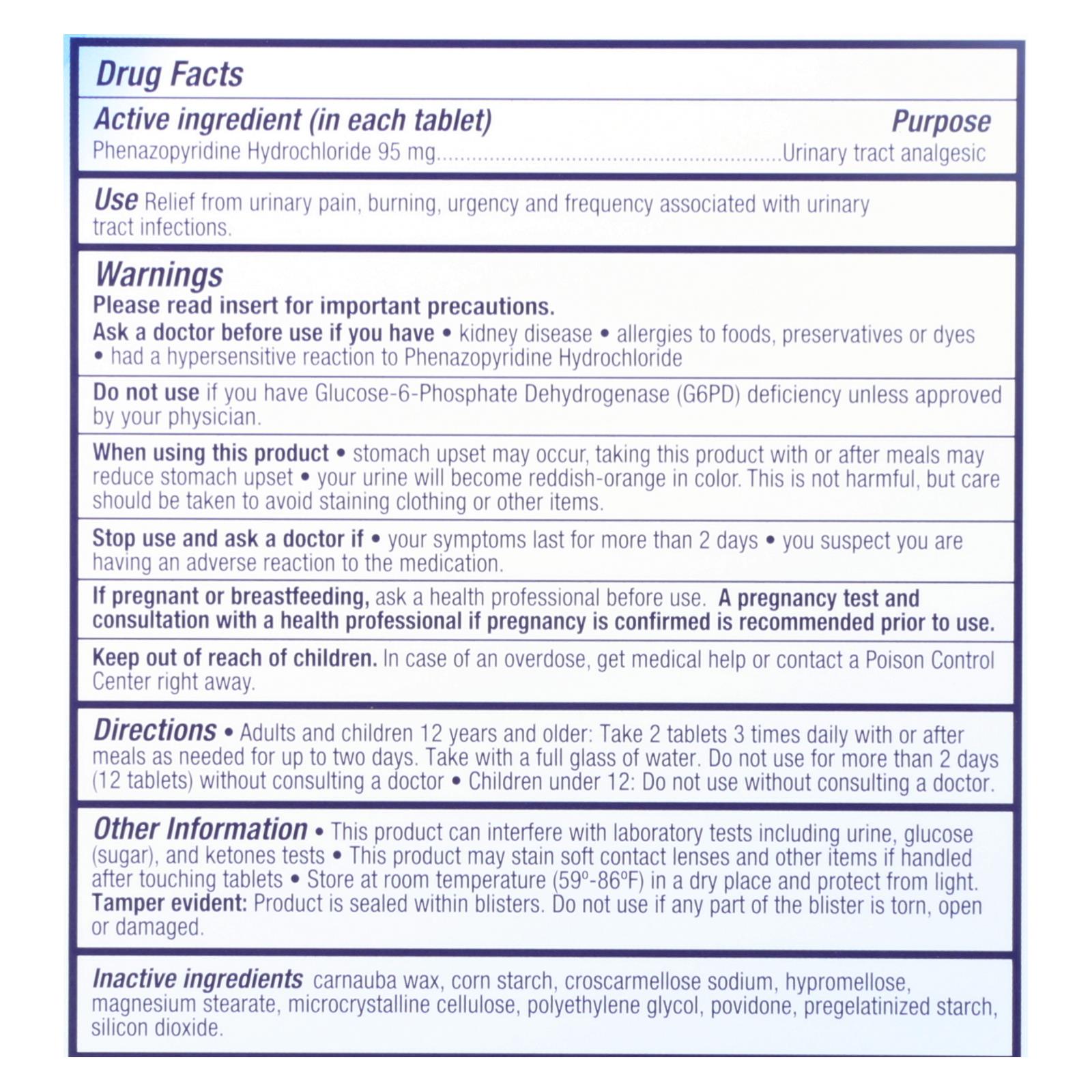Carnauba wax, corn starch, croscarmellose sodium, hypromellose, magnesium stearate, microcrystalline cellulose, polyethylene glycol, povidone, pregelatinized starch, silicon dioxide, phenazopyridine hydrochloride (95 mg).
