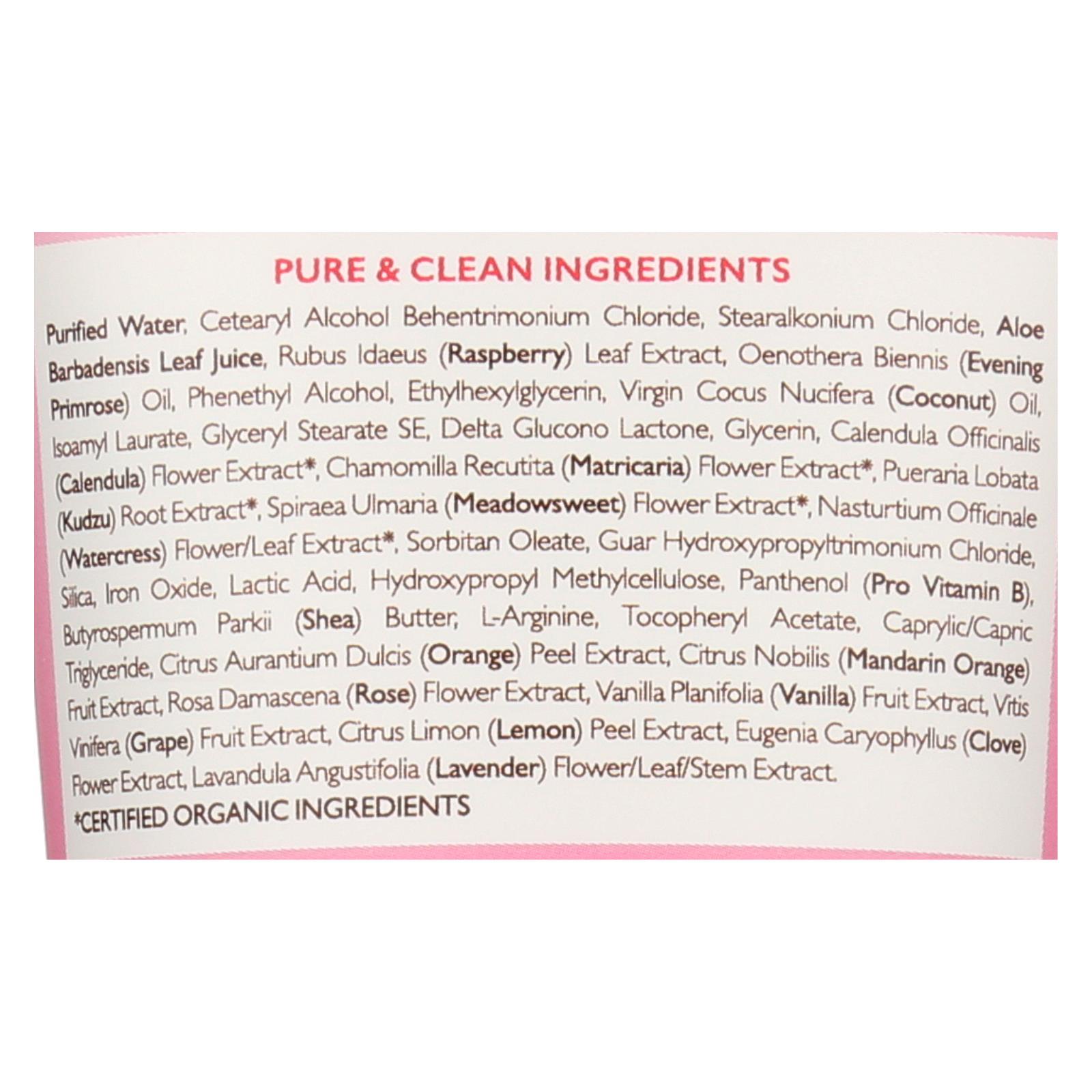 Purified water, cetearyl alcohol, behentrimonium chloride, stearalkonium chloride, aloe barbadensis (aloe vera) leaf juice, rubus idaeus (raspberry) leaf extract, oenothera biennis (evening primrose) oil, phenethyl alcohol, ethylhexylglycerin, virgin cocus nucifera (coconut), isoamyl laurate, glyceryl stearate SE, delta glucono lactone, glycerin, calendula officinalis (calendula) flower extract, chamomilla recutita (matricaria), pueraria lobata (kudzu) root extract, spiraea ulmaria (meadowsweet), nasturtium officinale (watercress) flower/leaf.