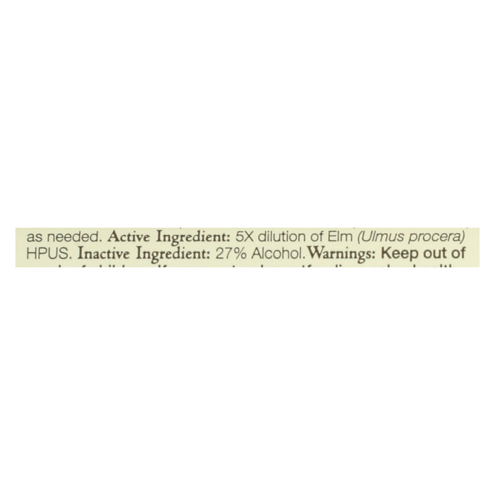 Active ingredient: 5x dilution of Elm (Ulmus procera, HPUS).