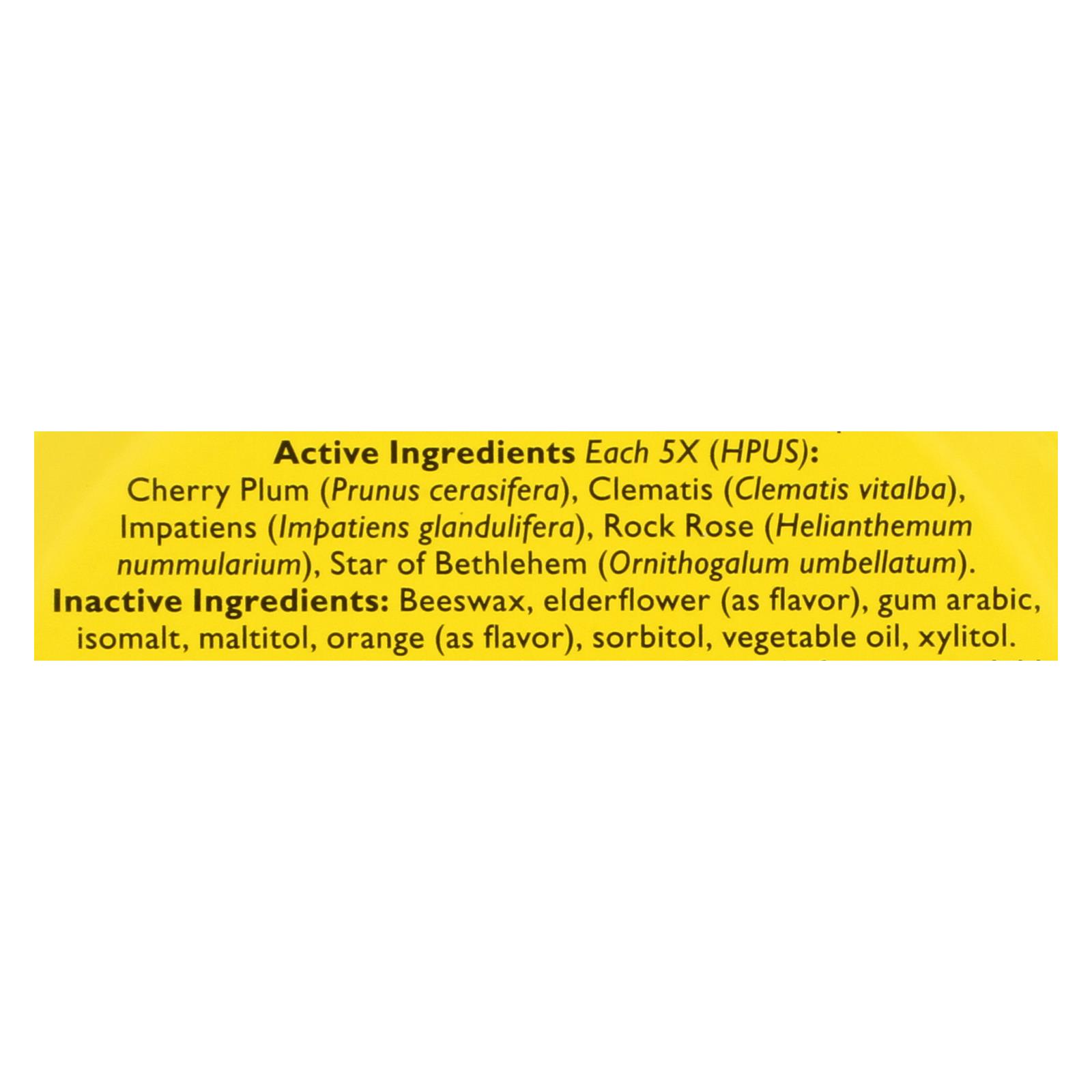 Active (each 5X HPUS): Cherry Plum (Prunus cerasifera), Clematis (Clematis vitalba), Impatiens (Impatiens glandulifera), Rock Rose (Helianthemum nummularium), Star of Bethlehem (Ornithogalum umbellatum). Inactive: Beeswax, Elderflower (as flavor), Gum Arabic, Isomalt, Maltitol, Orange, Sorbitol, Vegetable Oil, Xylitol.