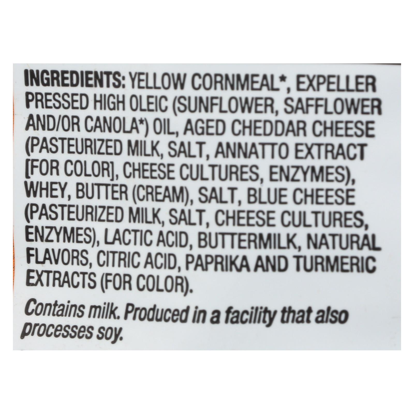 ingredients : yellow corn meal;expeller pressed high oleic oil;sunflower;safflower and/or canola;aged cheddar and blue cheese;pasteurized milk;salt;annatto extract [for color];cheese cultures;enzymes;whey;buttermilk solids;lactic acid;natural flavors;paprika and turmeric extracts;for color