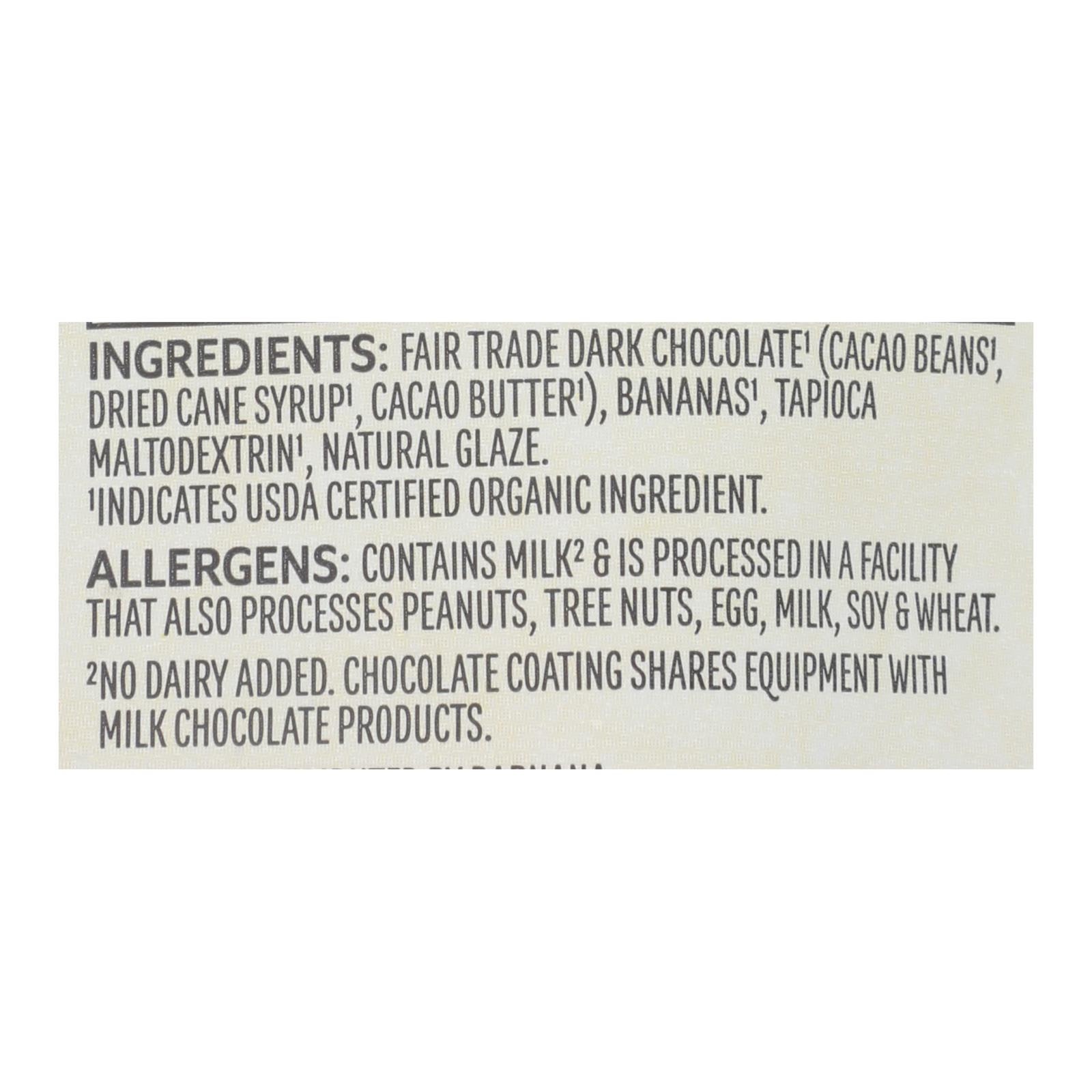 ingredients : fair trade dark chocolate (cacao beans , dried cane syrup , cacao butter );bananas ;tapioca maltodextrin ;natural glaze