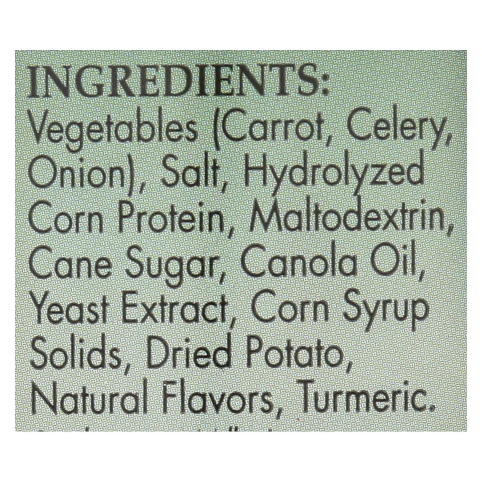 ingredients : vegetables (carrot, celery, onion);salt;hydrolyzed corn protein;maltodextrin;cane sugar;canola oil;yeast extract;corn syrup solids;dried potato;natural flavors;turmeric