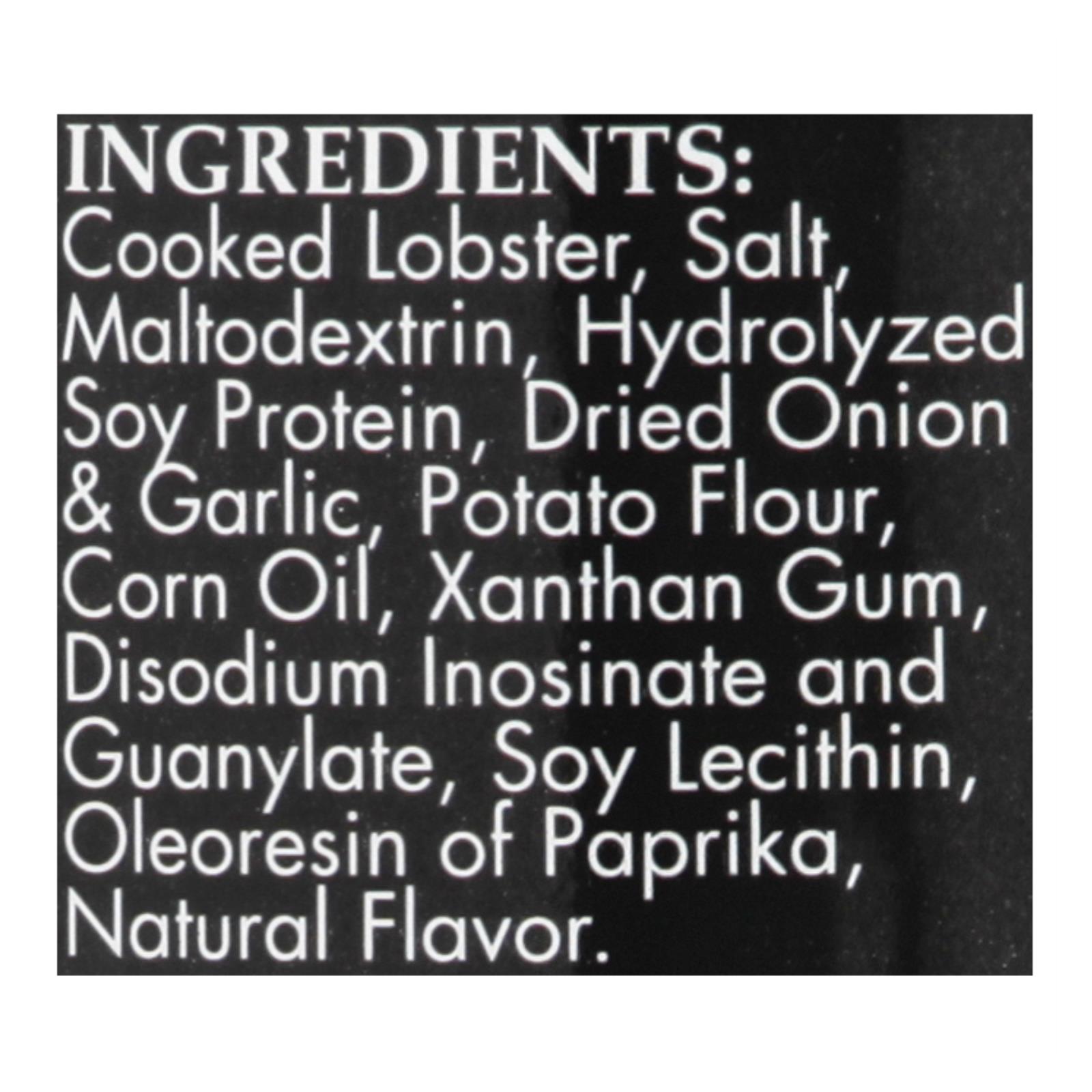 Cooked lobster, salt, maltodextrin, hydrolyzed soy protein, dried onion & garlic, potato flour, corn oil, xanthan gum, disodium inosinate and guanylate, soy lecithin, oleoresin of paprika, natural flavor.