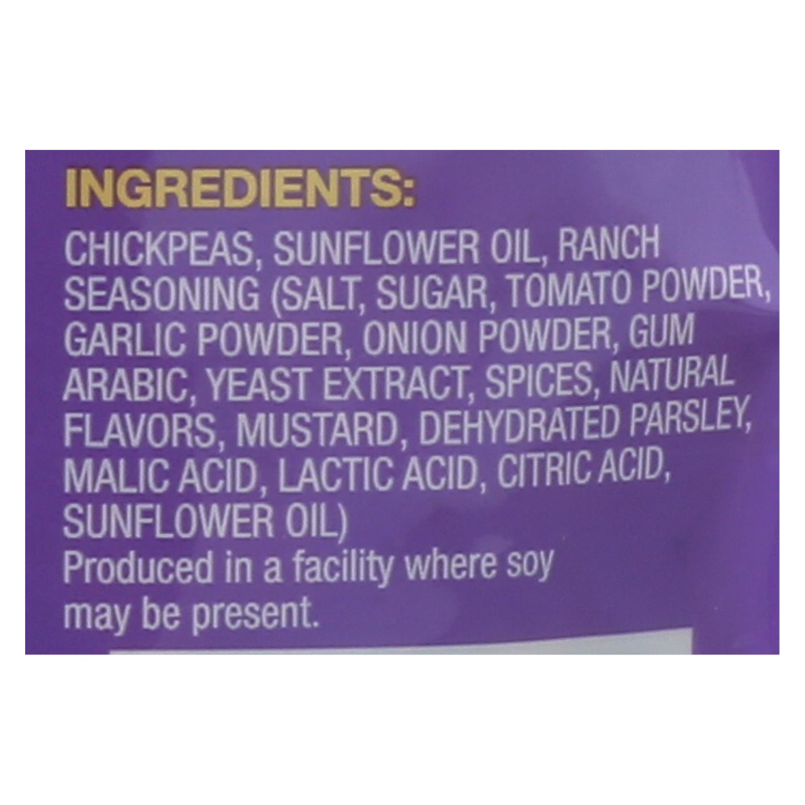ingredients : chickpeas;sunflower oil;ranch seasoning;salt;sugar;tomato powder;garlic powder;onion powder;gum arabic;yeast extract;spices;natural flavors mustard;dehydrated parsley;malic acid;lactic acid;citric acid