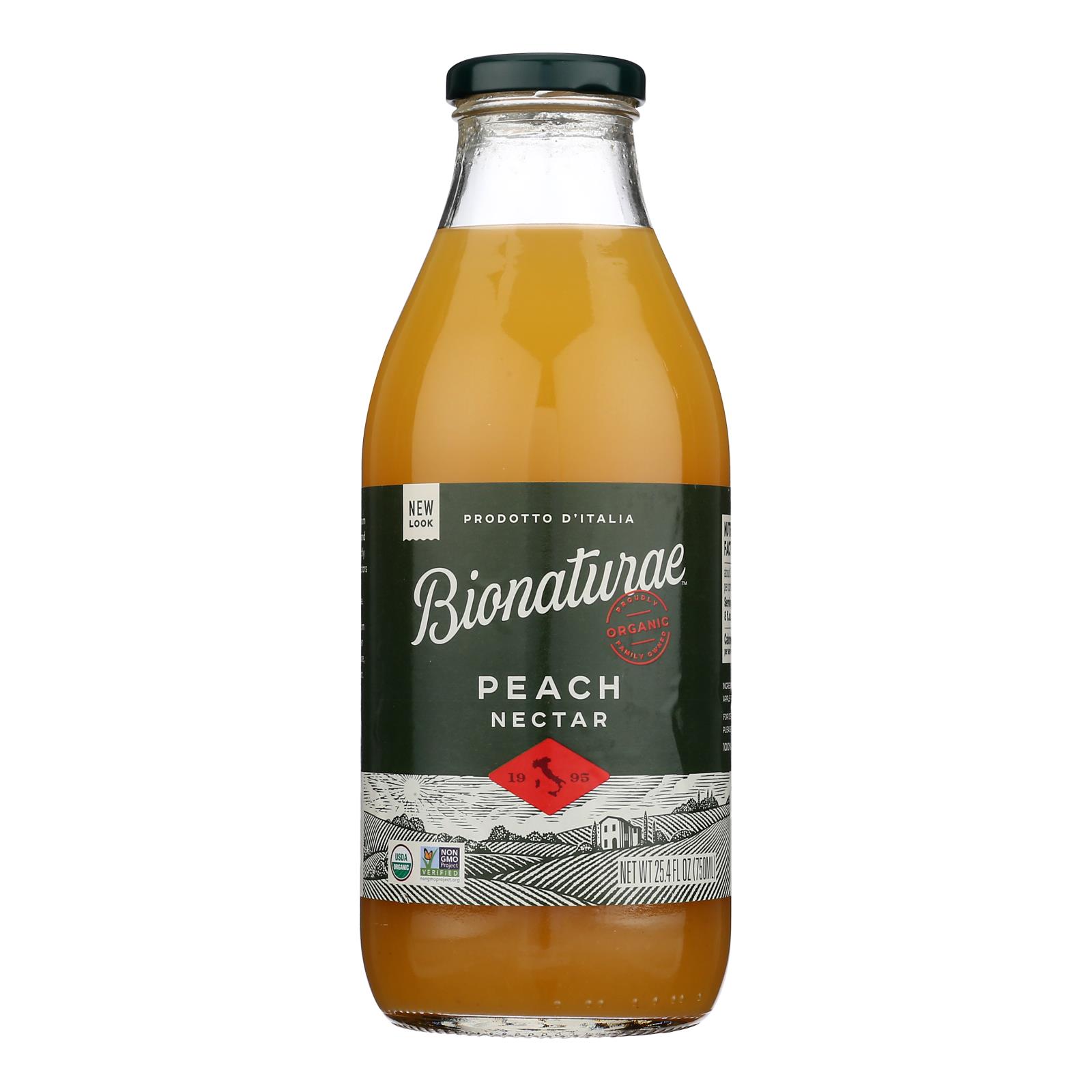 Bionaturae Organic Peach Nectar offers 25.4 oz of smooth, GMO-free juice made from handpicked fruit in a convenient case of 6