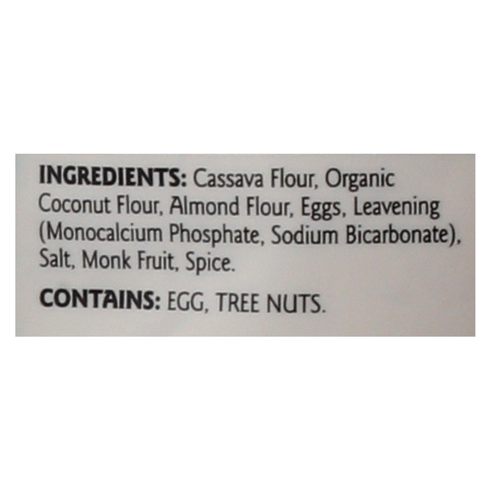 Cassava flour, organic coconut flour, almond flour, eggs, leavening (monocalcium phosphate, sodium bicarbonate), salt, monk fruit, spice.
