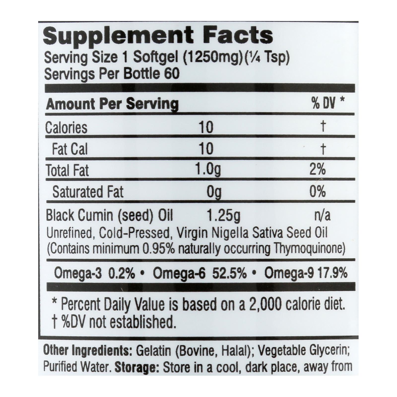 - Each softgel contains 1250 mg of black seed oil (equivalent to ¼ teaspoon of oil)
