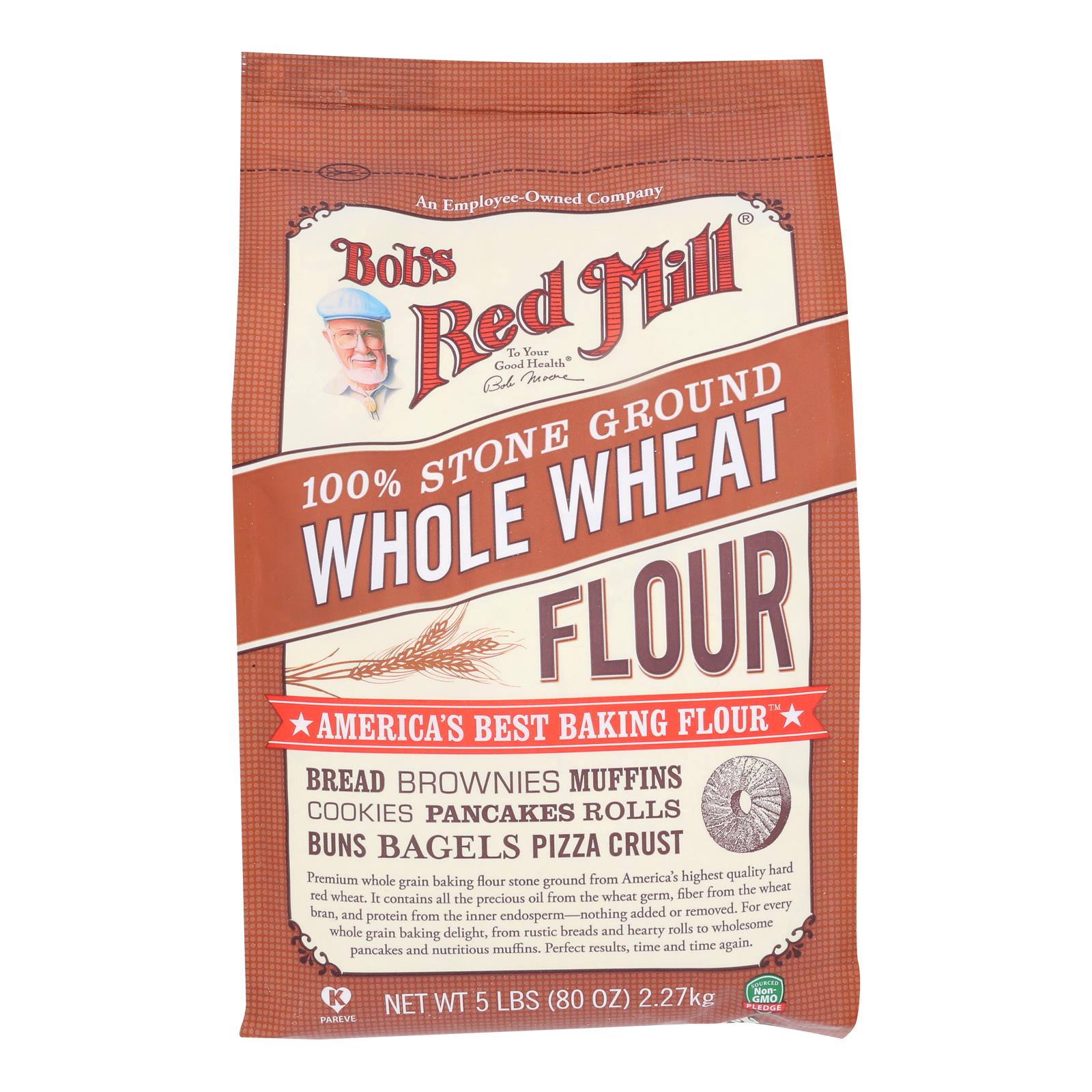 Bob’s Red Mill Whole Wheat Flour is a GMO-free, kosher 5 lb pack made from whole grain hard red wheat, sold in a convenient case of 8