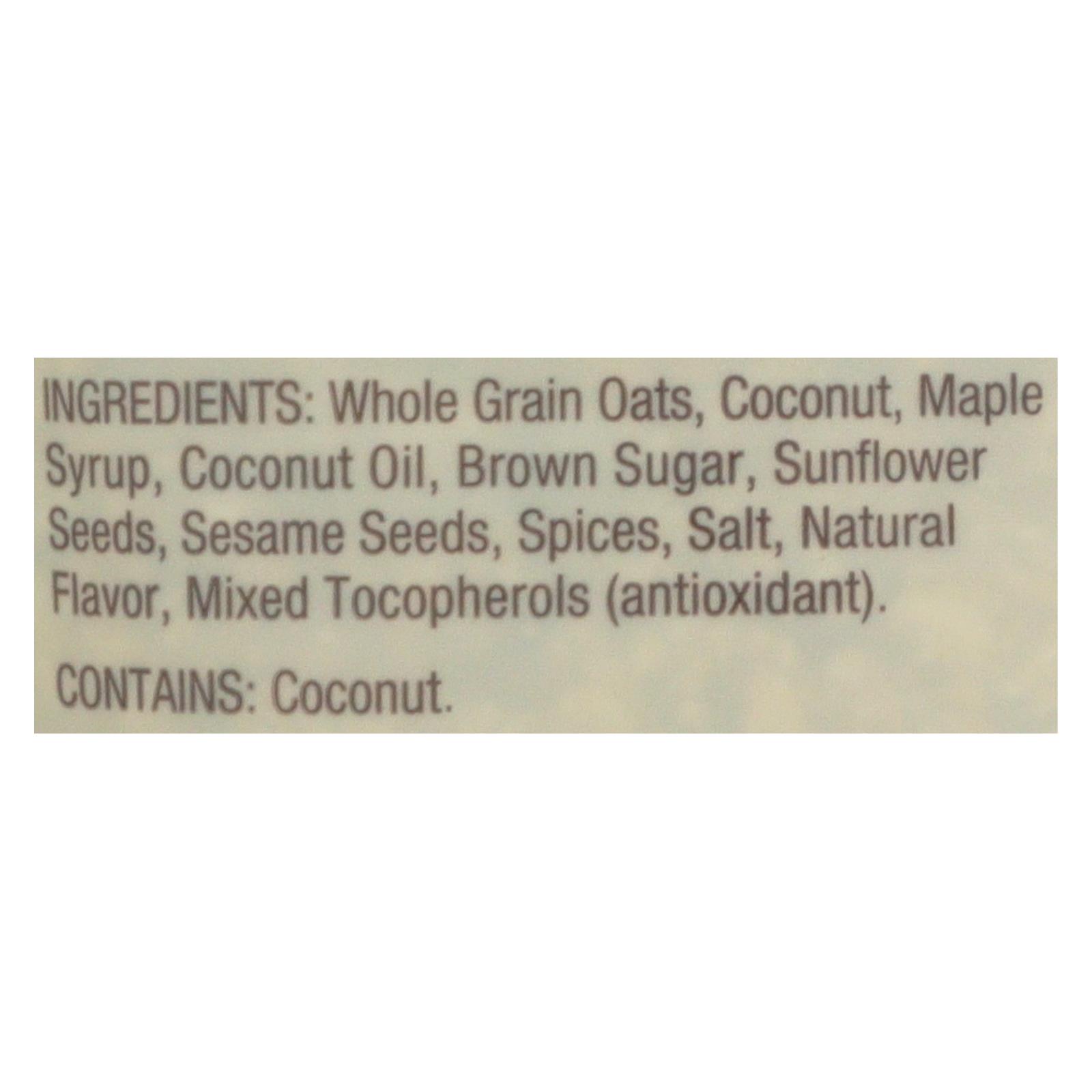 Whole grain oats, coconut, maple syrup, coconut oil, brown sugar, sunflower seeds, sesame seeds, spices, salt, natural flavor, mixed tocopherols (antioxidant).