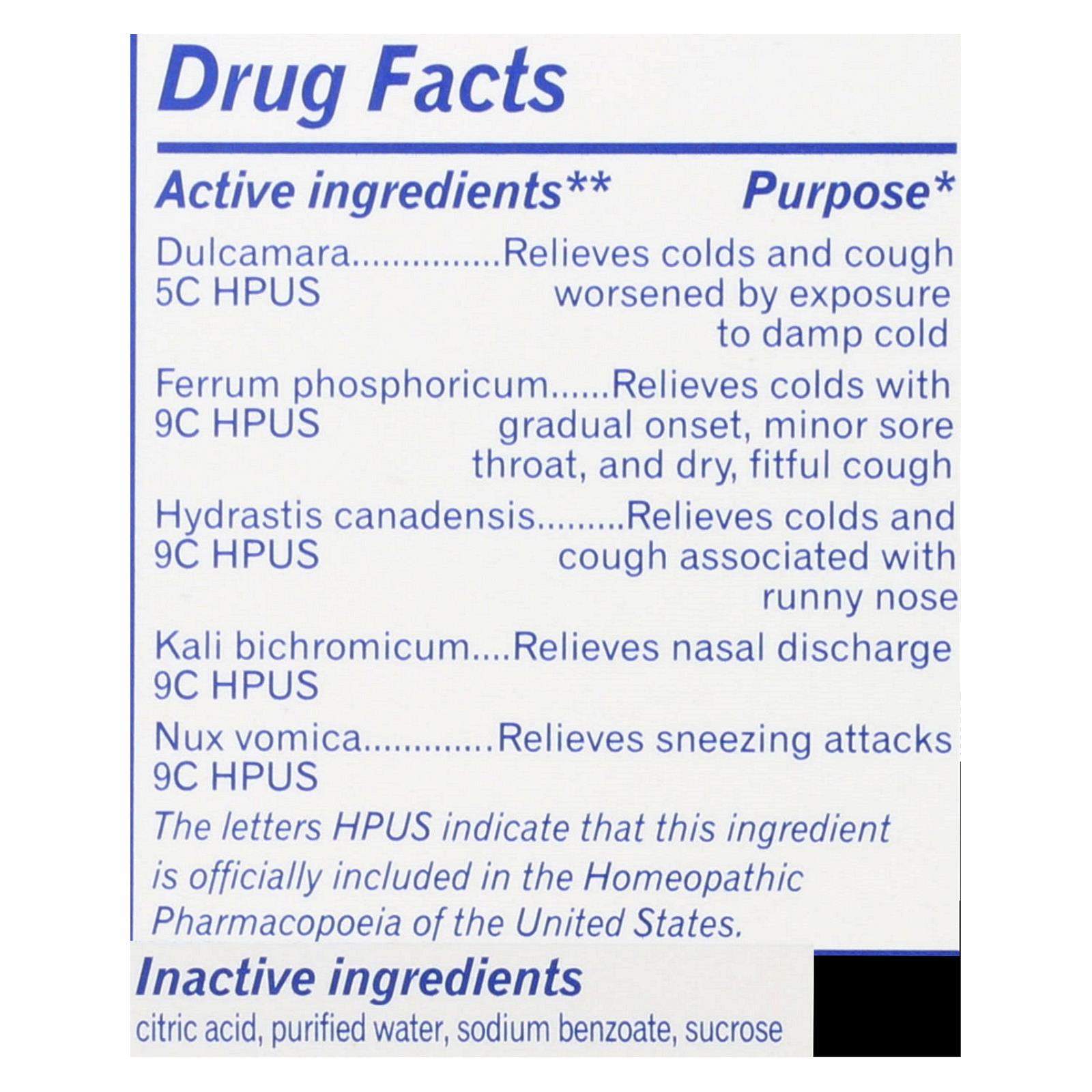 Active: Dulcamara 5C HPUS, Ferrum Phosphoricum 9C HPUS, Hydrastis Canadensis 9C HPUS, Kali Bichromicum 9C HPUS, Nux Vomica 9C HPUS. Inactive: Citric Acid, Purified Water, Sodium Benzoate, Sucrose.