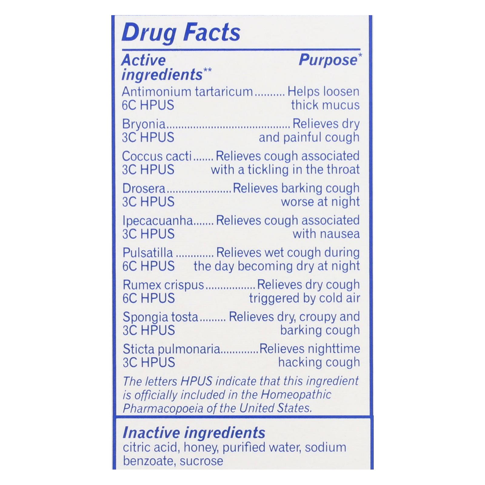 Active Ingredients: Antimonium tartaricum 6C HPUS, Bryonia 3C HPUS, Coccus cacti 3C HPUS, Drosera 3C HPUS, Ipecacuanha 3C HPUS, Pulsatilla 6C HPUS, Rumex crispus 6C HPUS.