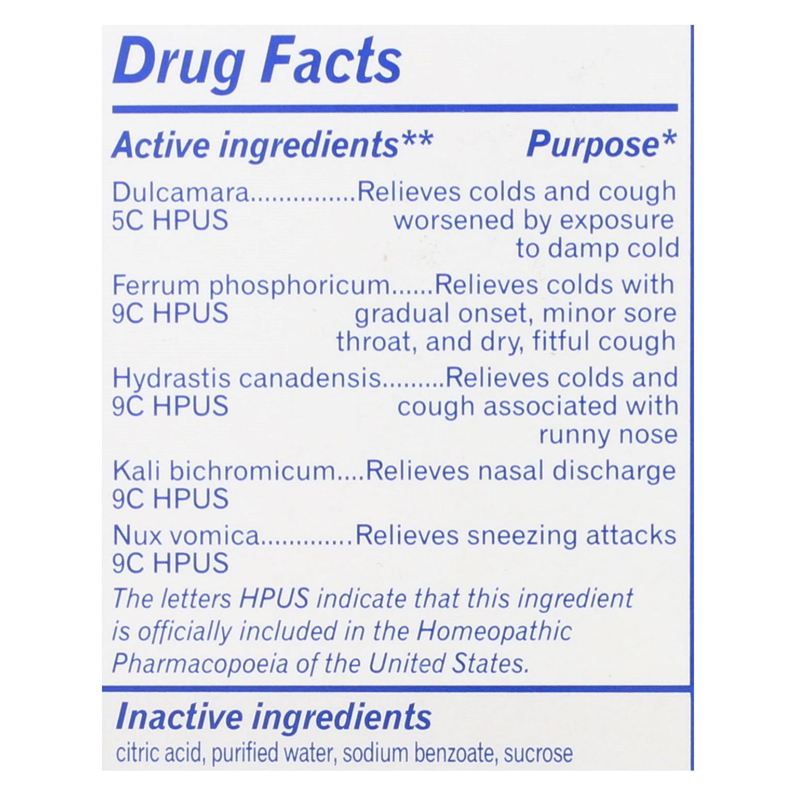 Active: Dulcamara 5C HPUS, Ferrum Phosphoricum 9C HPUS, Hydrastis Canadensis 9C HPUS, Kali Bichromicum 9C HPUS, Nux Vomica 9C HPUS.