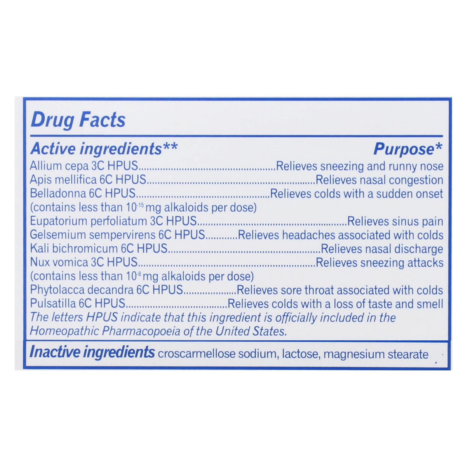 Allium cepa 3C HPUS, Apis mellifica 6C HPUS, Belladonna 6C HPUS (contains less than 10-15 mg alkaloids per dose), Eupatorium perfoliatum 3C HPUS, Gelsemium sempervirens 6C HPUS, Kali bichromicum 6C HPUS, Nux vomica 3C HPUS (contains less than 10-8 mg alkaloids per dose).
