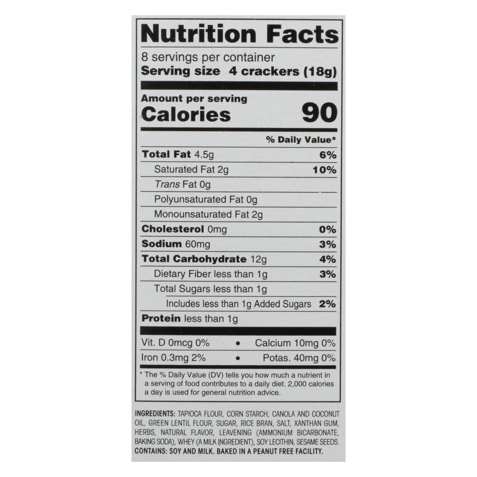 Tapioca flour, corn starch, canola and coconut oil, green lentil flour, sugar, rice bran, salt, xanthan gum, herbs, natural flavor, leavening (ammonium bicarbonate, baking soda), whey (a milk ingredient), soy lecithin, sesame seeds.