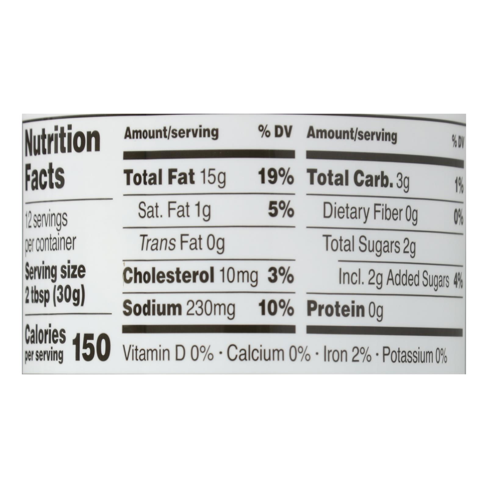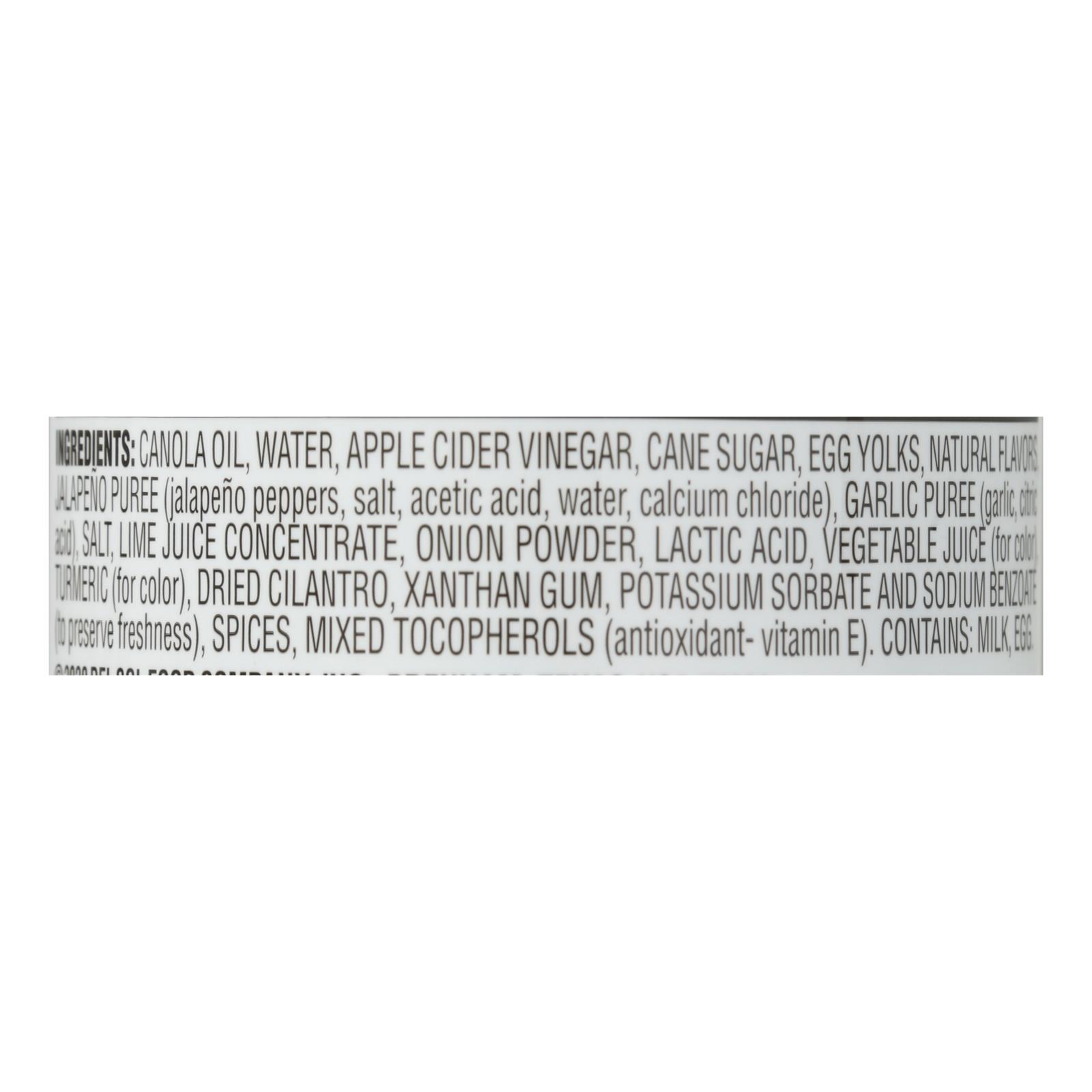 Canola oil, water, apple cider vinegar, cane sugar, egg yolks, natural flavors, jalapeno puree (jalapeno peppers, salt, acetic acid, water, calcium chloride), garlic puree (garlic, citric acid), salt, lime juice concentrate, onion powder, lactic acid, vegetable juice (for color), turmeric (for color), dried cilantro, xanthan gum, potassium sorbate and sodium benzoate (to preserve freshness), spices, mixed tocopherols (antioxidants – vitamin E).