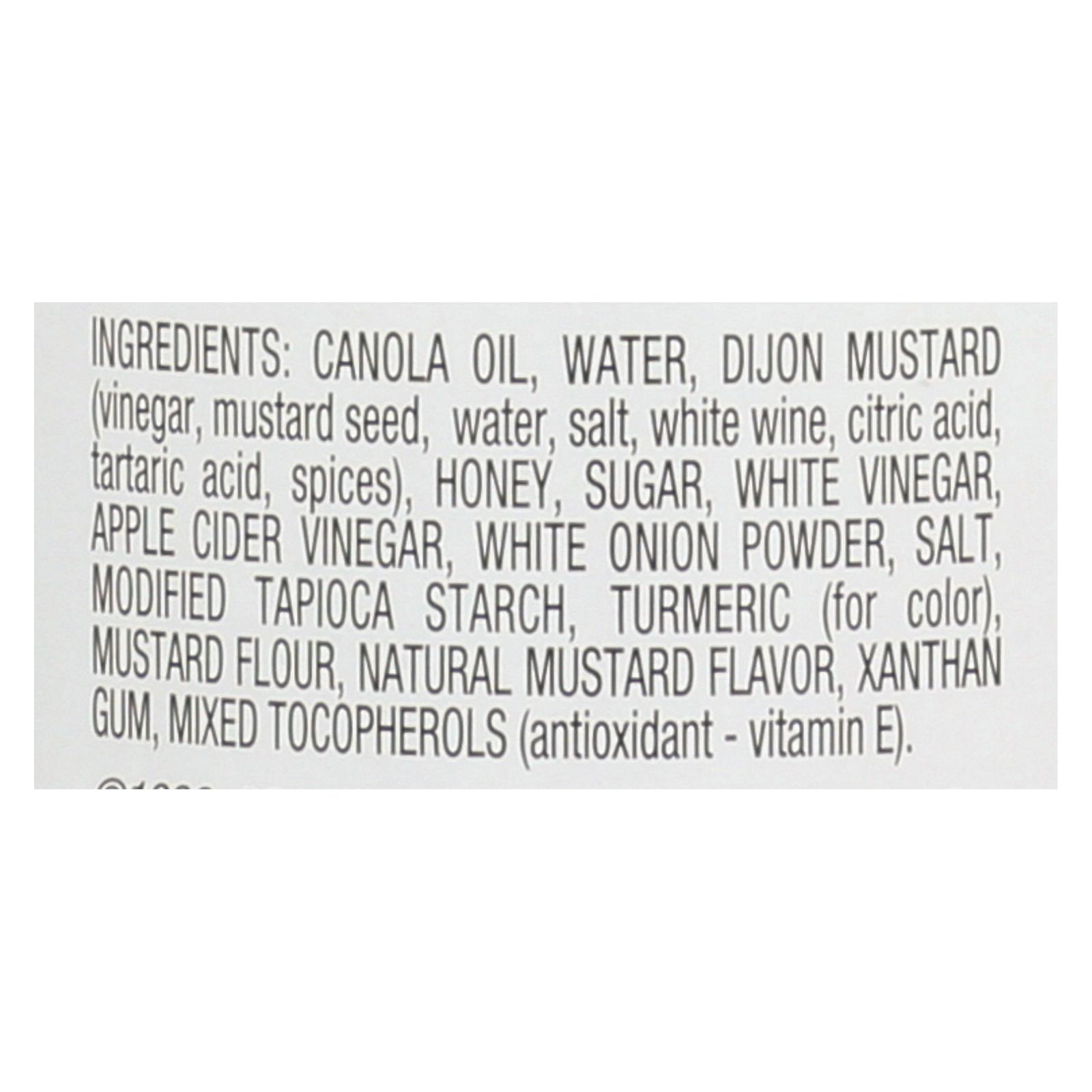 ingredients : canola oil;water;dijon mustard (distilled vinegar, mustard seed, water, sea salt, white wine, citric acid, tartaric acid, spices);honey;cane sugar;white vinegar;apple cider vinegar;onion powder;salt;modified tapioca starch;turmeric (for color);mustard flour;mustard flavor;xanthan gum;mixed tocopherols (antioxidants-vitamin e)