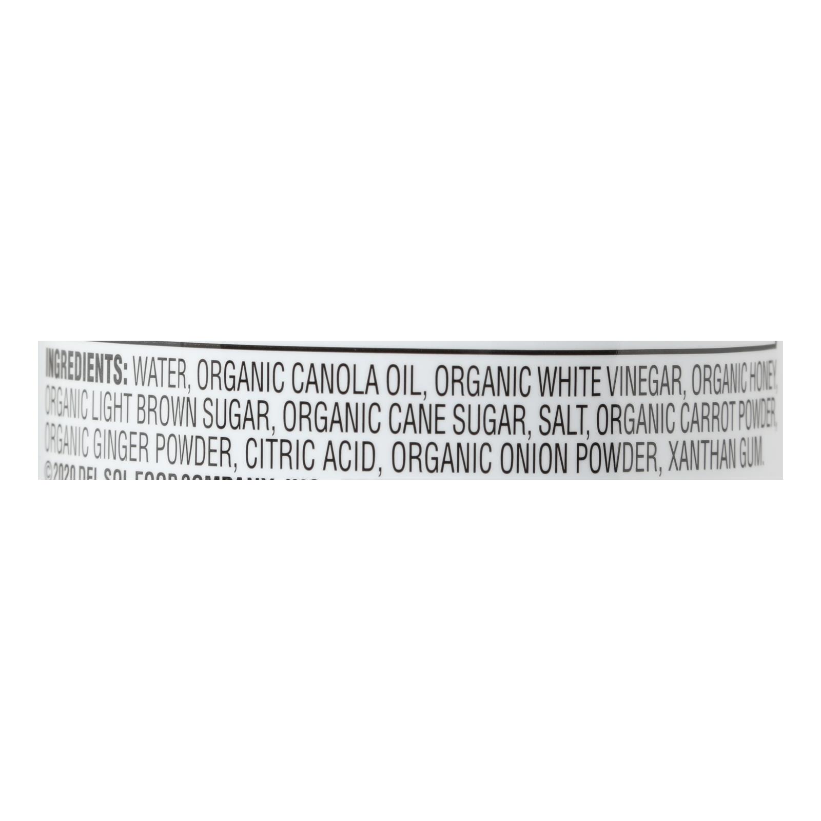 Water, organic canola oil, organic white vinegar, organic honey, organic light brown sugar, organic cane sugar, salt, organic carrot powder, organic ginger powder, citric acid, organic onion powder, xanthan gum.