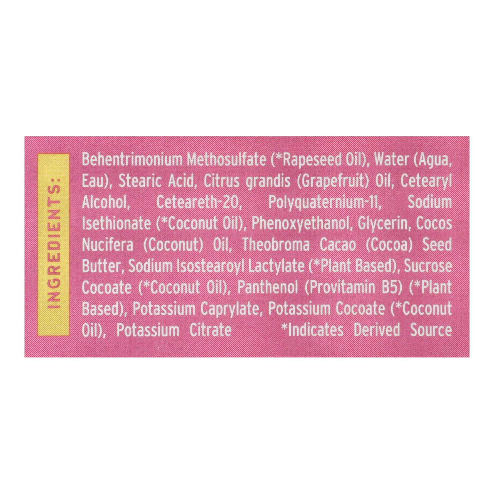 Behentrimonium methosulfate (from rapeseed oil), water (agua, eau), stearic acid, citrus grandis (grapefruit) oil, cetearyl alcohol, ceteareth-20, polyquaternium-11, sodium isethionate (from coconut oil), phenoxyethanol, glycerin, cocos nucifera (coconut) oil, theobroma cacao (cocoa) seed butter, sodium isostearoyl lactylate (plant based), sucrose cocoate (from coconut oil), panthenol (provitamin B5, plant based), potassium caprylate, potassium cocoate (from coconut oil), potassium citrate.