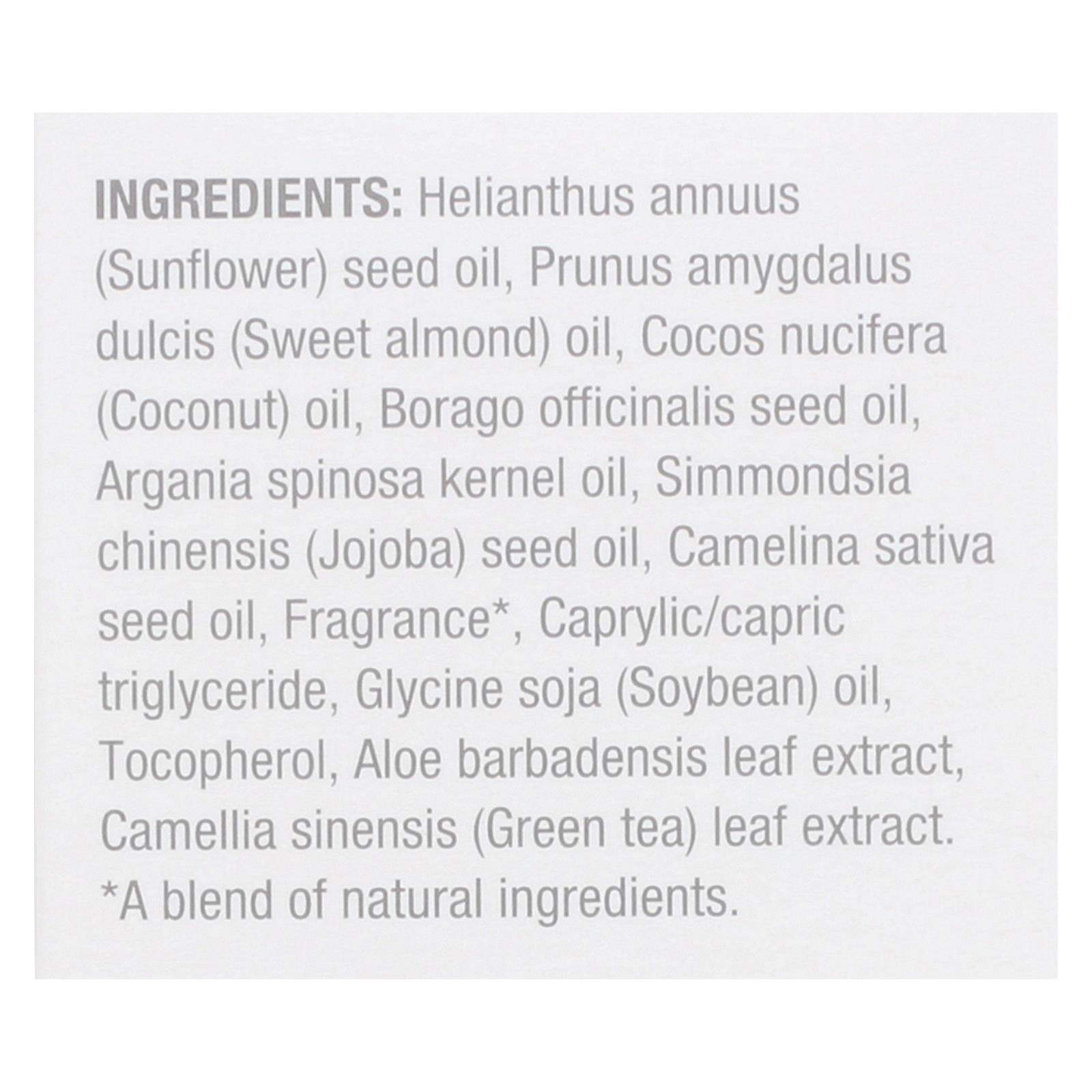 ingredients : helianthus annuus;sunflower;seed oil;prunus amygdalus dulcis;sweet almond;oil;cocos nucifera;coconut;borago officinalis seed oil;argania spinosa kernel oil;simmondsia chinensis;jojoba;camelina sativa seed oil;fragrance;caprylic/capric triglyceride;glycine soja;soybean;tocopherol;aloe barbadensis leaf extract;camellia sinensis;green tea;leaf extract
