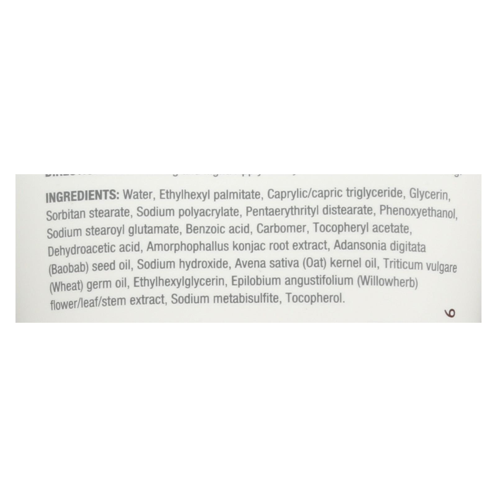 ingredients : water;ethylhexyl palmitate;caprylic/capric triglyceride;glycerin;sorbitan stearate;sodium polyacrylate;pentaerythrityl distearate;phenoxyethanol;sodium stearoyl glutamate;benzoic acid;carbomer;tocopheryl acetate;dehydroacetic acid;amorphophallus konjac root extract;adansonia digitata;baobab;seed oil;sodium hydroxide;avena sativa;oat;kernel oil;triticum vulgare;wheat;germ oil;ethylhexylglycerin;epilobium angustifolium;willowherb;flower/leaf/stem extract;sodium metabisulfite;tocopherol
