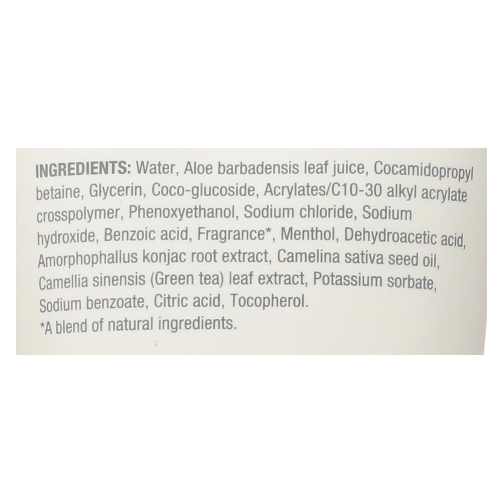 Water, Aloe Barbadensis Leaf Juice, Cocamidopropyl Betaine, Glycerin, Coco-Glucoside, Acrylates/C10-30 Alkyl Acrylate Crosspolymer, Phenoxyethanol, Sodium Chloride, Sodium Hydroxide, Benzoic Acid, Fragrance, Menthol, Dehydroacetic Acid, Amorphophallus Konjac Root Extract, Camelina Sativa Seed Oil, Camellia Sinensis (Green Tea) Leaf Extract, Potassium Sorbate, Sodium Benzoate, Citric Acid, Tocopherol.