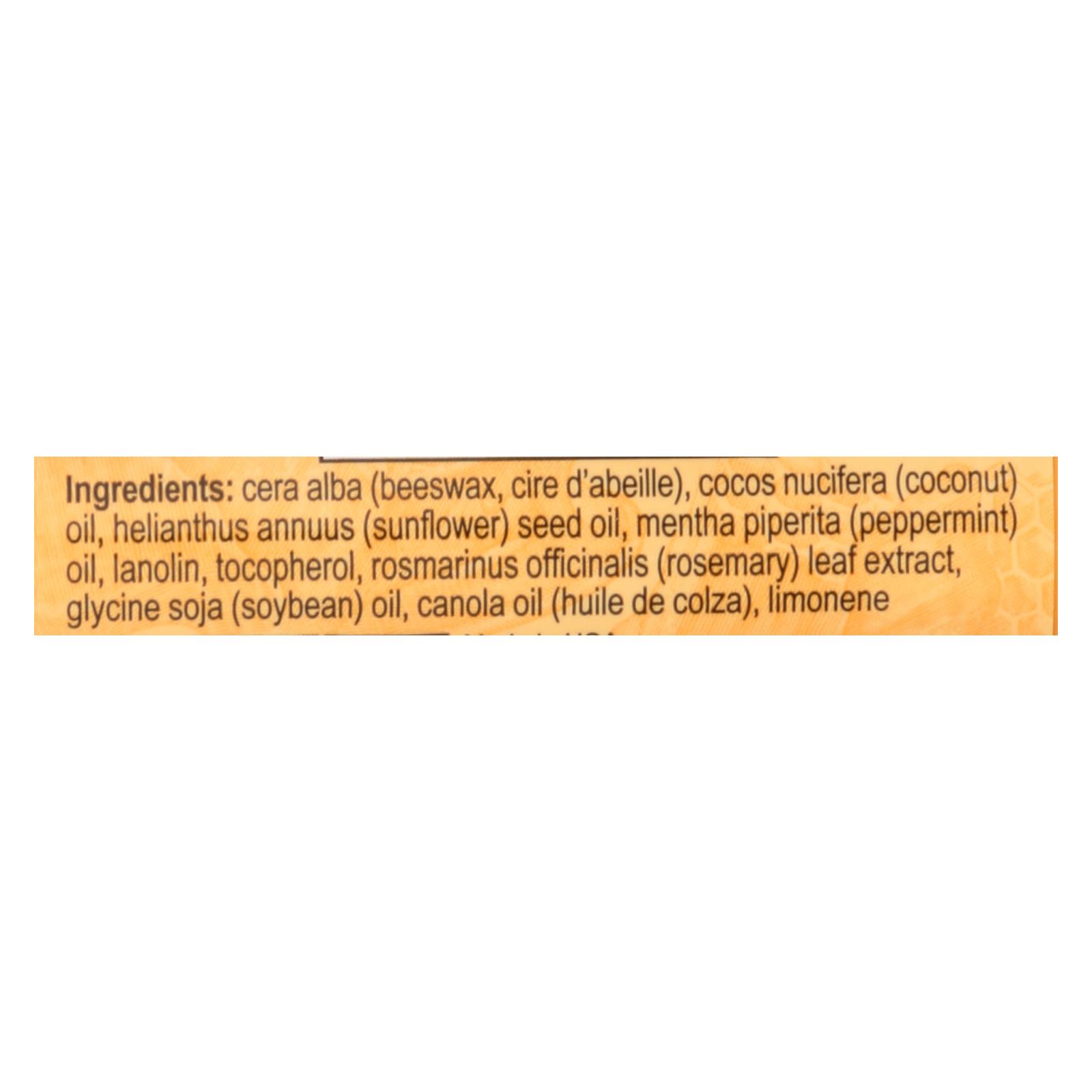 Beeswax, Cocos Nucifera (Coconut) Oil, Helianthus Annuus (Sunflower) Seed Oil, Mentha Piperita (Peppermint) Oil, Lanolin, Tocopherol, Rosmarinus Officinalis (Rosemary) Leaf Extract, Glycine Soja (Soybean) Oil, Canola Oil, Limonene, Linalool, Eugenol.
