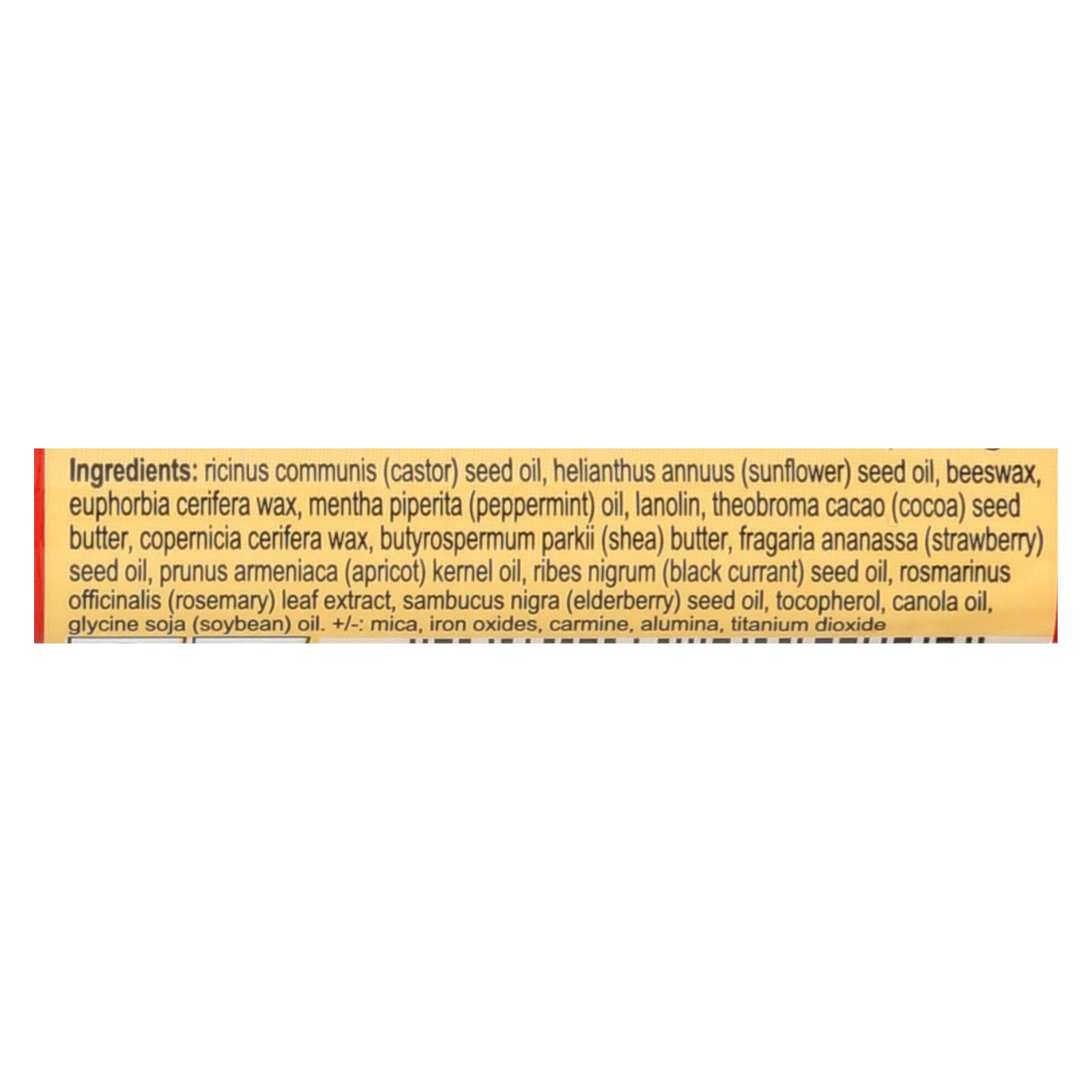 ingredients : ricinus communis (castor) seed oil;helianthus annuus (sunflower) seed oil;cera alba [beeswax];candelilla cera [euphorbia cerifera (candelilla) wax];mentha piperita (peppermint) oil;lanolin;mica;theobroma cacao (cocoa) seed butter;copernicia cerifera (carnauba) wax;ci 77891 [titanium dioxide];cl 75470 [carmine];butyrospermum parkii (shea) butter;fragaria ananassa (strawberry) seed oil;prunus armeniaca (apricot) kernel oil;ribes nigrum (black currant) seed oil;rosmarinus officinalis (rosemary) lea