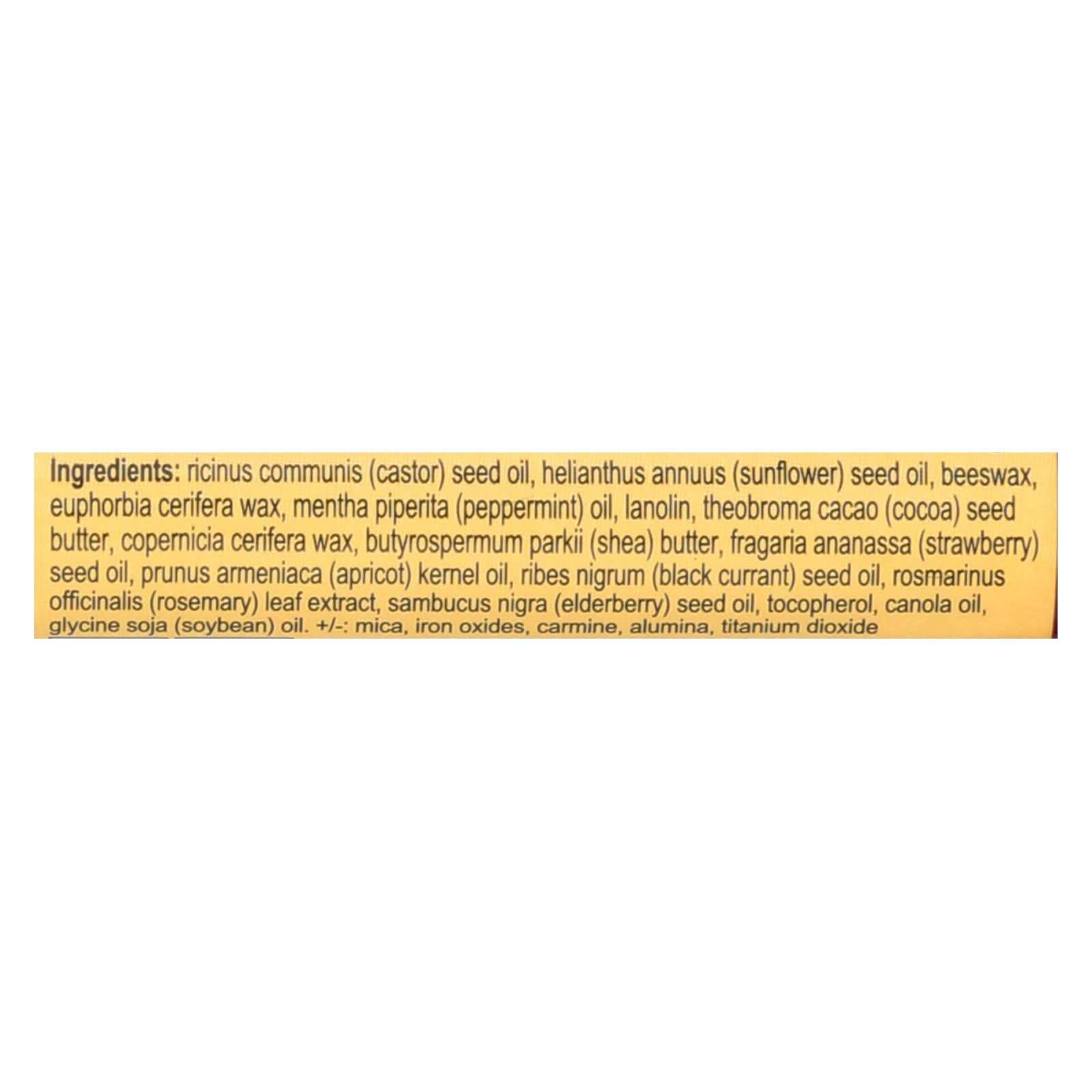 ingredients : ricinus communis (castor) seed oil;helianthus annuus (sunflower) seed oil;cera alba [beeswax];candelilla cera [euphorbia cerifera (candelilla) wax];mentha piperita (peppermint) oil;lanolin;mica;theobroma cacao (cocoa) seed butter;copernicia cerifera (carnauba) wax;ci 77491 [iron oxides];butyrospermum parkii (shea) butter;fragaria ananassa (strawberry) seed oil;prunus armeniaca (apricot) kernel oil;ribes nigrum (black currant) seed oil;rosmarinus officinalis (rosemary) leaf extract;sambucus nigra