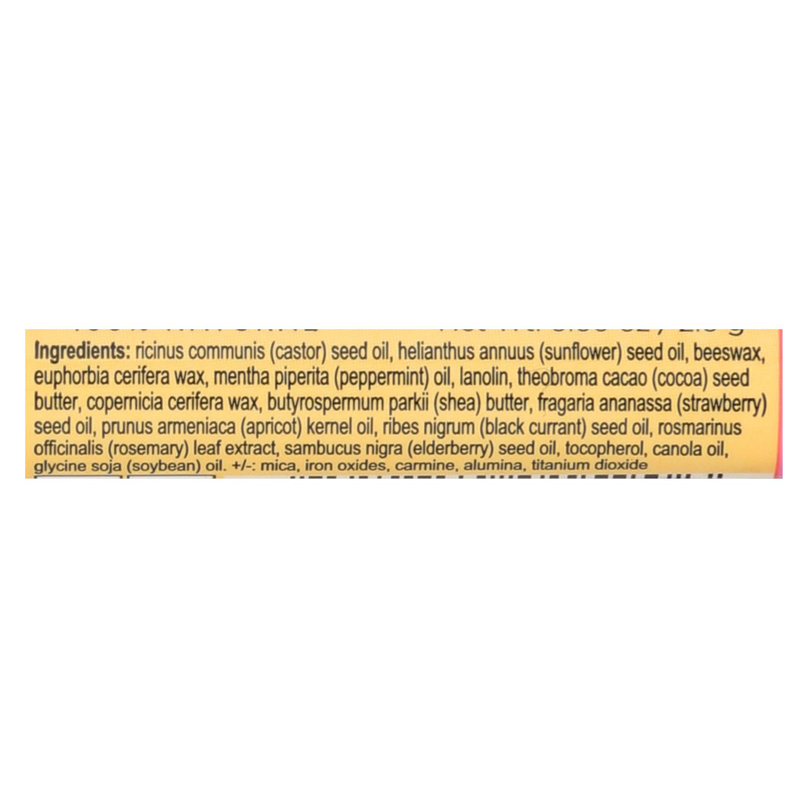 Ricinus communis (castor) seed oil, Helianthus annuus (sunflower) seed oil, Cera alba (beeswax), Mica, Candelilla cera (Euphorbia cerifera/candelilla wax), Mentha piperita (peppermint) oil, Lanolin, CI 77891 (titanium dioxide), Theobroma cacao (cocoa) seed butter, Copernicia cerifera (carnauba) wax, Butyrospermum parkii (shea) butter, Fragaria ananassa (strawberry) seed oil, Prunus armeniaca (apricot) kernel oil, Ribes nigrum (black currant) seed oil, Rosmarinus officinalis (rosemary) leaf extract, Sambucus.