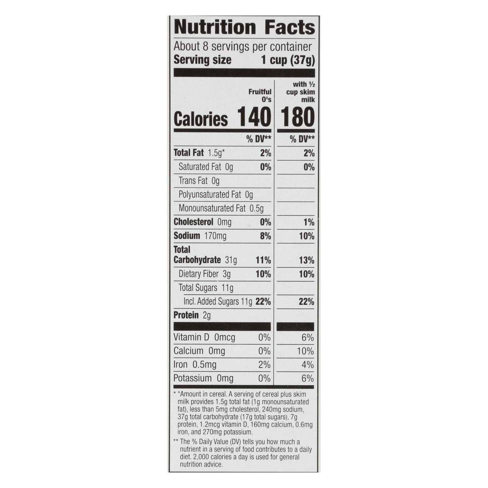 Cascadian farm fruitful o’s, naturally fruit flavored sweetened organic corn & oat cereal is a healthy and delicious breakfast cereal. Made primarily from natural ingredients, this cereal is largely free of unnatural and unnecessary additives. This product is non-gmo, organic and kosher. Each box of cascadian farm fruitful o’s, naturally fruit flavored sweetened organic corn & oat cereal weighs 10.2 oz. With 10 servings per box and 100 calories per serving. See nutrition facts panel for allergens.